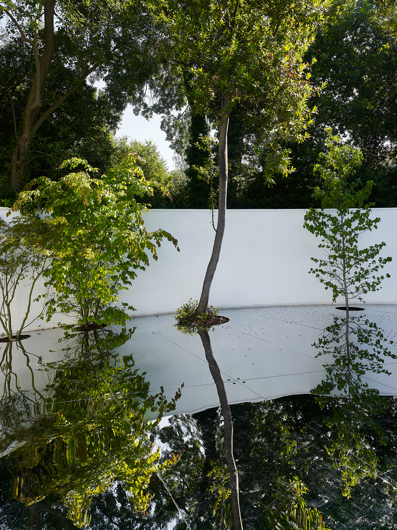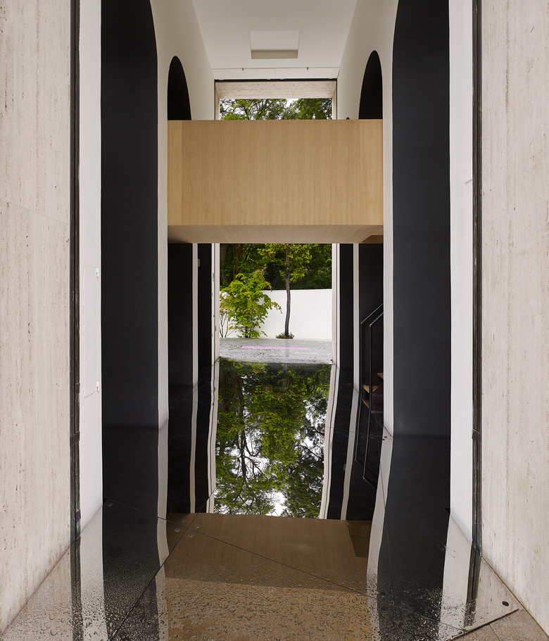 Sei es nun eine Folge der Anwendung des goldenen Schnitts im historischen Entwurf oder einfach purer Zufall, die Sphäre im Österreichischen Pavillon misst einen Radius von 128 Metern und steht im Verhältnis von 1:50.000 zur Erde. Die sichtbare, gekrümmte Fläche ist wie die Erde selbst ein Körper. Ein Boden-Körper, dessen verspiegelte Oberfläche von der Dualität des Raums erzählt und unser Verhältnis zur Erde hinterfragt. Sie veranschaulicht einen Raum, in dem man sich sieht, wo man nicht ist und vergegenwärtigt jenen Ort, an dem man sich befindet. Sie krümmt, verzerrt, transloziert und ermöglicht einen maßstäblichen Sprung, einen Sprung in ein Außen, in ein Außerhalb des Gegebenen und Vorstellbaren. So wird der Spiegel zum Instrument der Abweichung anstatt der Symmetrie. Symmetrie und Abweichung stehen einander wechselseitig gegenüber und erweitern die Räume des Pavillons.