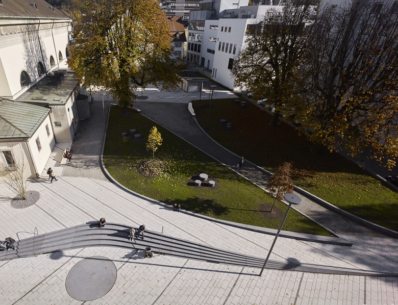 Die Stadtkante als topographische Gegebenheit wird transformiert. Sitzstufen werden als Tribüne konzipiert, dadurch entsteht ein Forum, welches nach Südwesten ausgerichtet ist und ein Sitzen in der Sonne mit Blick auf die Schnittstelle Mozartgasse - Schulgasse – Europagasse ermöglicht. Maßnahmen: Stadtmöblierung - Sitzstufen, Stadtleuchten, Bestehende Baumgruppe wird zentraler Teil des Ortes.