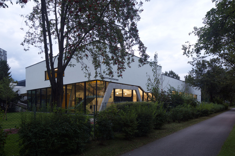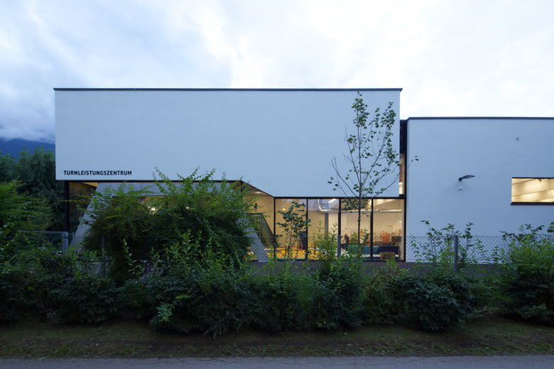 Städtebaulich positioniert sich der Neubau am Westende der Turnhalle, der Zugang erfolgt an der Südseite an einem parallel zur Innpromenade geführten Weg. Das Foyer des Zubaus ist transparent und ermöglicht bei Bedarf eine Öffnung in Richtung Schulhof.