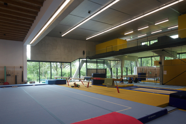Der architektonische Fokus liegt auf dem gestaltgebenden Potenzial der auskragenden Tribünenkonstruktion. Einerseits wird dadurch die Ästhetik klassischer Sportbauten thematisiert, andererseits setzt das kompakte Obergeschoss die schlichte Haltung der Turnhalle fort und ermöglicht so das Wahrnehmen der Baukörper als Gesamtkomplex.