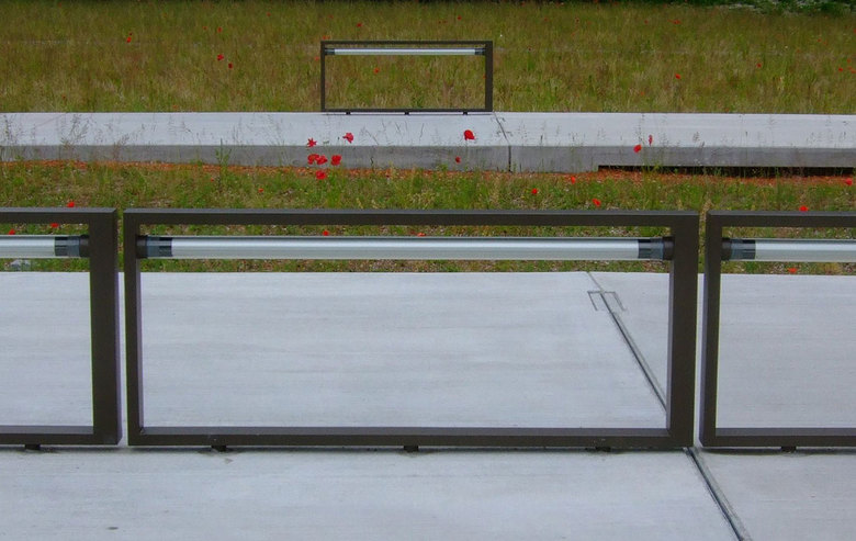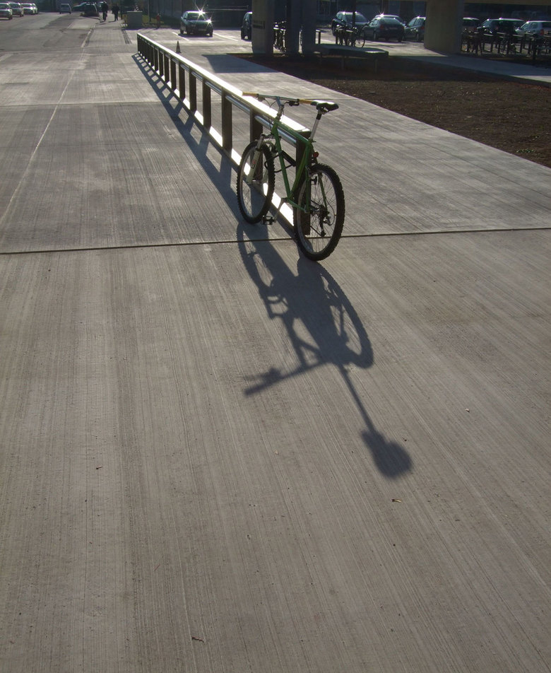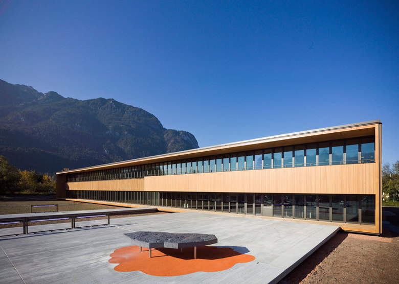 Der Eingangsbereich wurde mit einer großzügigen Platte aus Ortbeton mit Besenstrich versehen. Alle Ausstattungsgegenstände wie Lampen, Radlbügel, Poller und Fahnenmasten sind in einer einheitlichen, eigenständigen Gestaltsprache entworfen.
