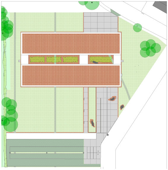Der Neubau des Finanzamtes steht auf einem ehemaligen Kasernengelände. Spuren dieser Nutzung zu sichern und zu verarbeiten ist ein Inhalt der Freiflächenplanung. So wurden Materialen wie vorhandene Granit-Großsteine verwendet um den Parkplatz zu bauen. Der Einsatz von Ziegelgruß aus den geschredderten Backsteinmauern der Kasernengebäude auf dem Dach, als Traufstreifen und im Substrat der Magerwiese sowie die Markierung ehemaliger Gleistrassen mit Bändern aus Bahnschotter sind weitere verarbeitete Spuren. Die Abbrucharbeiten der Kasernengebäude waren in dem Auftrag enthalten.