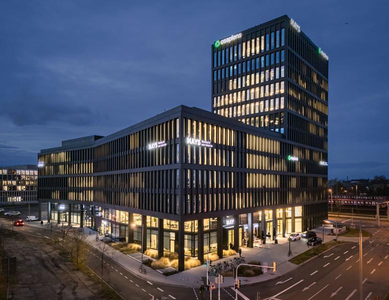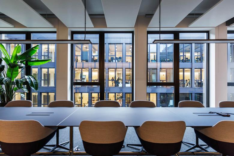 Alle Office-Bereiche zeichnen sich durch eine hohe räumliche Flexibilität aus. Eine aktivierte Mittelzone lässt eine Vielzahl agiler Arbeits-möglichkeiten zu um flexible Arbeitswelten für wechselnde Anforderungen zu bieten. Kommunikatives Arbeiten und Projektarbeit in Gruppen findet in größeren Flächen statt. Unterschiedliche Rückzugsmöglichkeiten und Besprechungsinseln bieten Raum für konzentriertes Arbeiten oder kurzfristig anberaumte Zusammenkünfte. So werden ein dynamisches Arbeiten und Kommunikation gefördert und Beziehungen gebaut. Besprechungsräume, Teeküchen und Cafeterias sind wichtige Räume für Erholung und Austausch zwischen den Mitarbeitern. Sie liegen nach Innen zum Hof ausgerichtet und stellen einen weiteren wichtigen Ort der Kommunikation dar.
