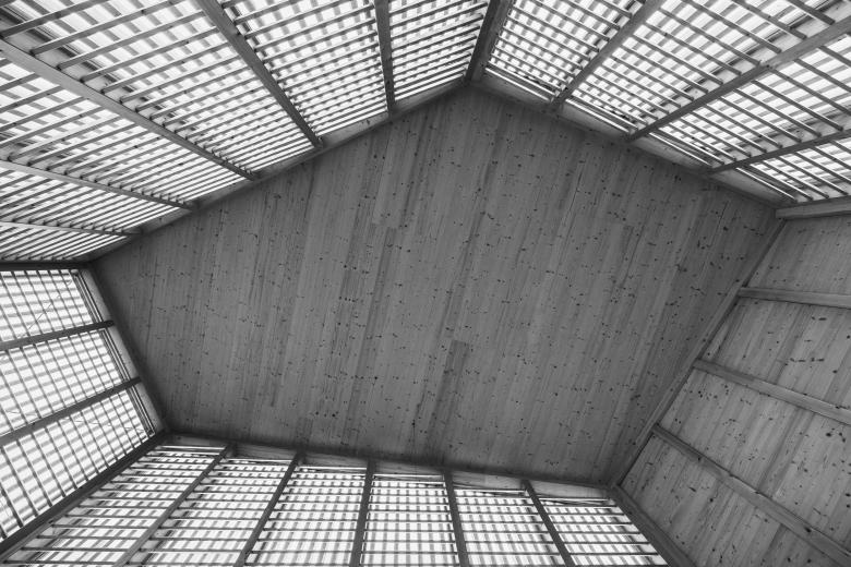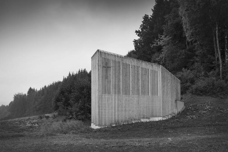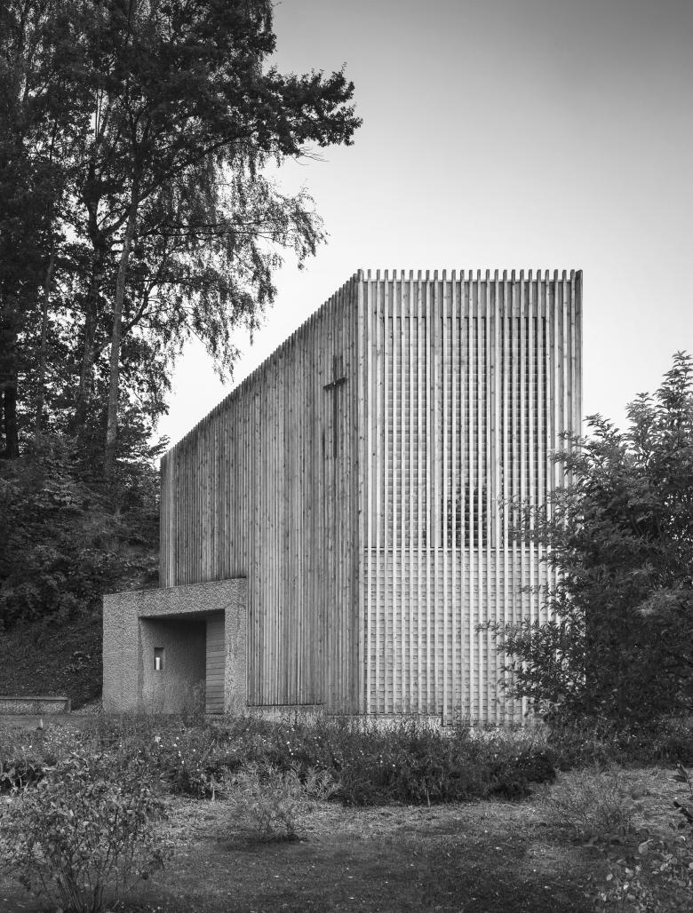 Dieser erzeugt durch seine Reduktion auf Konstruktion und Materialität eine Atmosphäre, die den Alltag ausblendet und so zum Innehalten einlädt. Nach oben hin lösen sich die raumbildenden Wände in ihre Konstruktion auf und erzeugen in Kombination mit der vertikalen Fassadenstruktur, den horizontalen Lamellen im Innenraum und dem Lichteinfall eine sakrale Stimmung und unverwechselbare Identität.