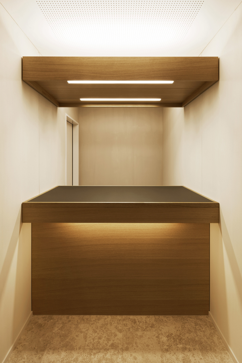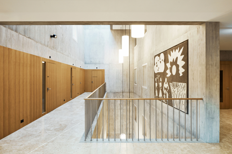 Im lichtdurchflutete Innenhof, dem Herzen des Gebäudes, schweben von uns entiwckelte Pendelleuchten. Sie bringen dem öffene Raum gleichzeitig Repräsentanz durch ihre Grösse und eine heitere Stimmung durch ihre brilliantes Licht.