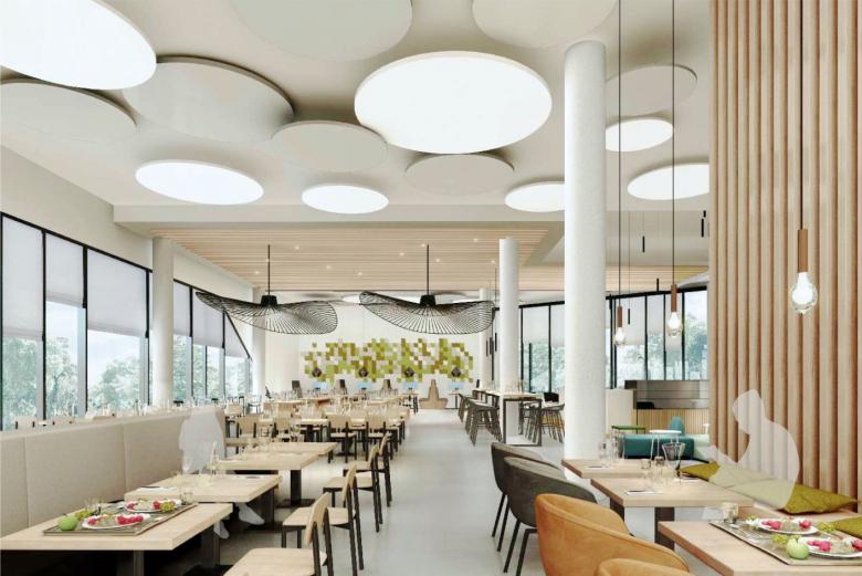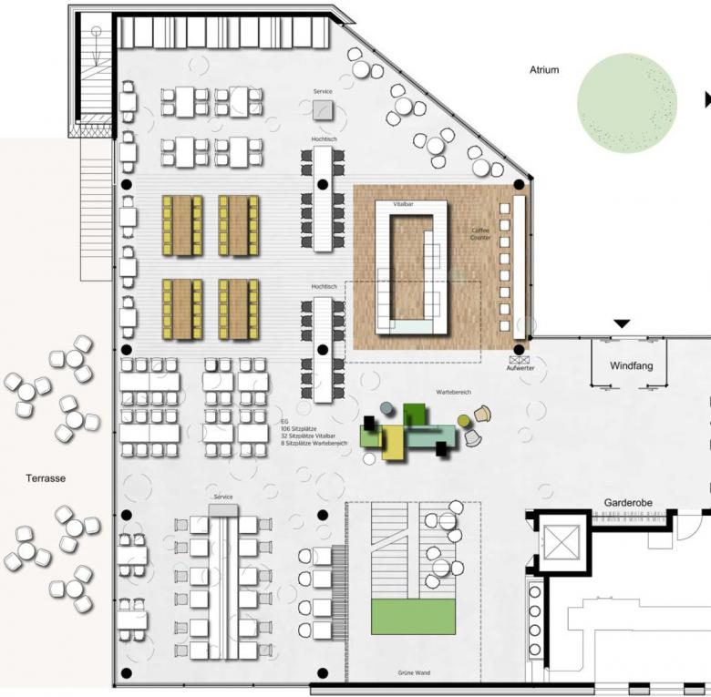 Entwurf eines Mitarbeiter Restaurants für eine Konzernverwaltung. Pure Materialien und ein freundliches Ambiente zeichnen das Design aus.
