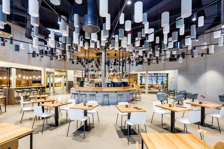 Beim Entwurf der Mitarbeiterkantine auf dem Verwaltungscampus eines großen Konzerns in Mülheim an der Ruhr wurde viel Wert auf nachhaltige Materialien gelegt.