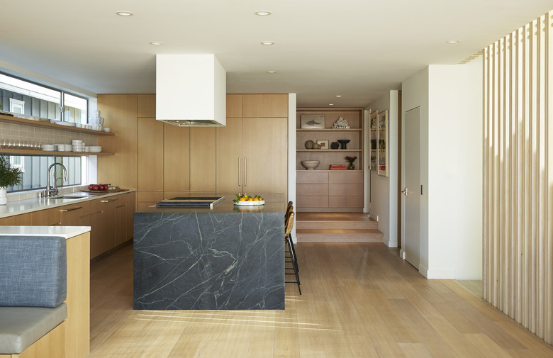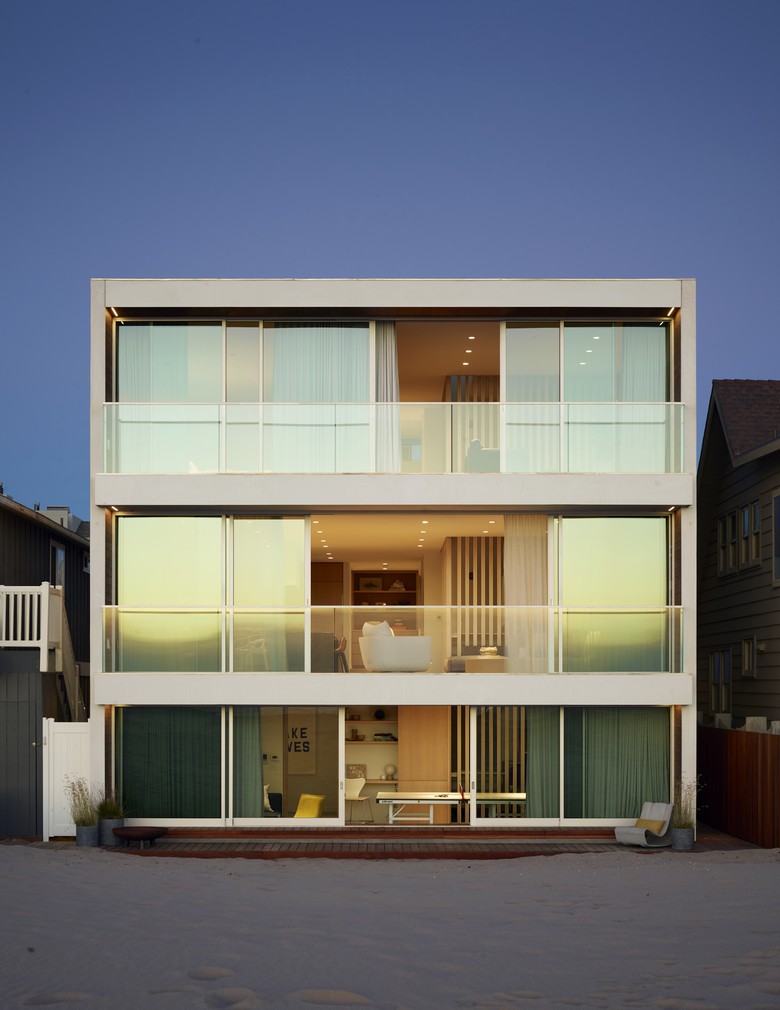 Located directly on the beach, this multi-family summer home involves three basic design concepts: Public Facade, Core Circulation, and Screening Neighbors. Facing the public street, a dominant brise soleil obscures views to pedestrians, but leaks sunlight to interior rooms. This fenestrated privacy feature is expressed on the facade as a volumetric mass floating above the recessed garage and dematerialized entry. Beyond the glass-box entry, a circulation core pierces all three-stories and isolates superfluous traffic to a center; the stairs are flooded with natural light from striated cuts above and vertical plate glass. The core is considered the connective tissue, both spatially and socially, as the stairs are frequented by family members. An adjacent elevator assists elderly family members between the first floor kids space, to common areas on the second level, and private quarters above. The client is an avid cook, therefore, the kitchen is strategically placed in close proximity with the living and dining area to energize the space and maintain the second floor as the programmatic center. A first floor walkout allows for easy beach access, while balconies on the top floors are flanked with screens to frame ocean views and grant privacy from nearby neighbors. The material palate perpetuates casual beach life through washed-out wood stains and crisp monochromatic colors coupled with smooth and textured finishes.