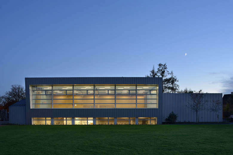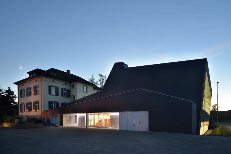 Das Primarschulhaus in Basadingen aus dem Jahr 1969 grenzt an einen erhaltenswerten Schulbau aus dem 19. Jahrhundert. Die maroden Flachdächer eines Zwischentrakts und der Turnhalle wurden zu Schrägdächern ausgebaut, um geschickt die kontrollierte Lüftung mit Wärmerückgewinnung für die Garderoben aufzunehmen. Die Dach- und Fassadenverkleidung wurde mit durchgehenden Aluminiumprofilen als zusammenhängendes Band neugestaltet. Zur Einbettung in die ländliche Umgebung wurde an den Giebelfassaden Eternitwaben verwendet.