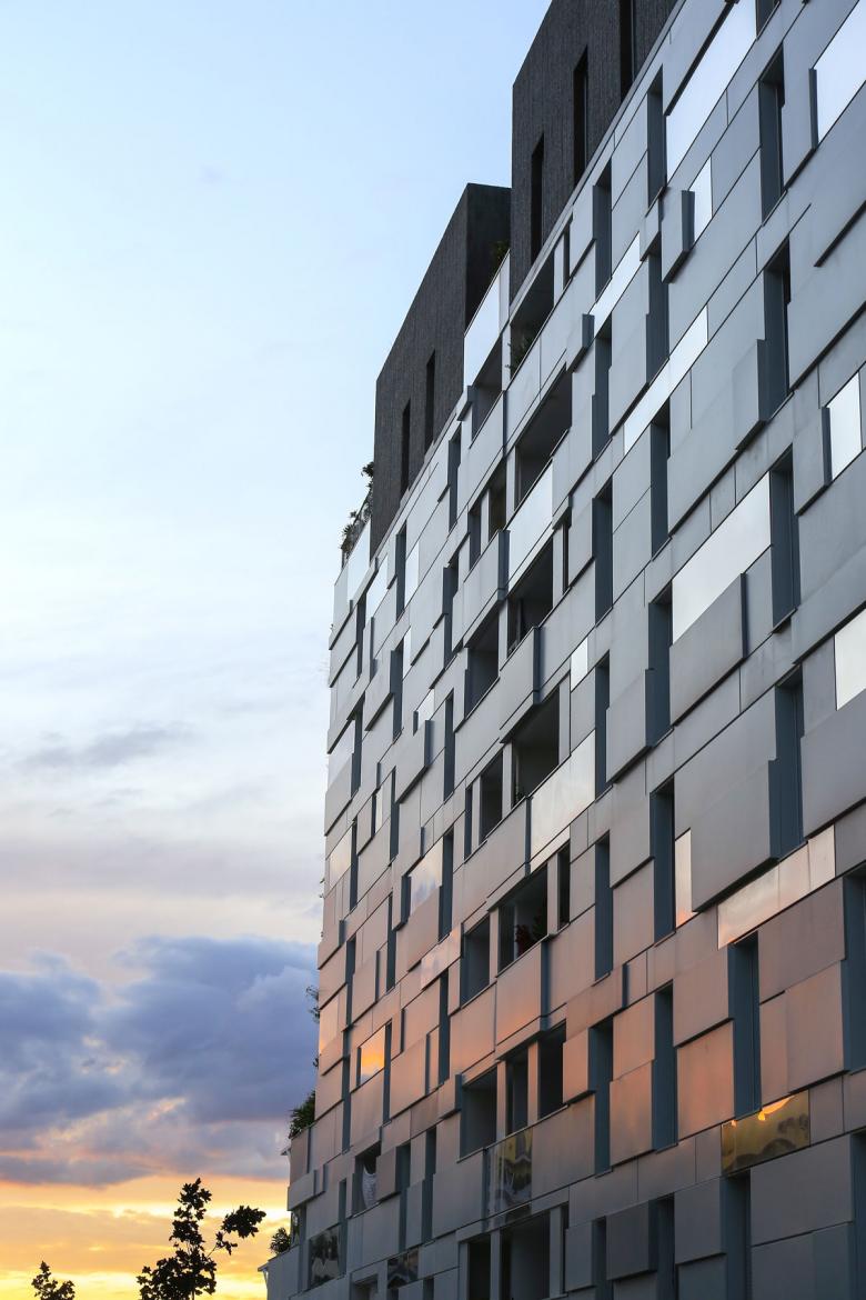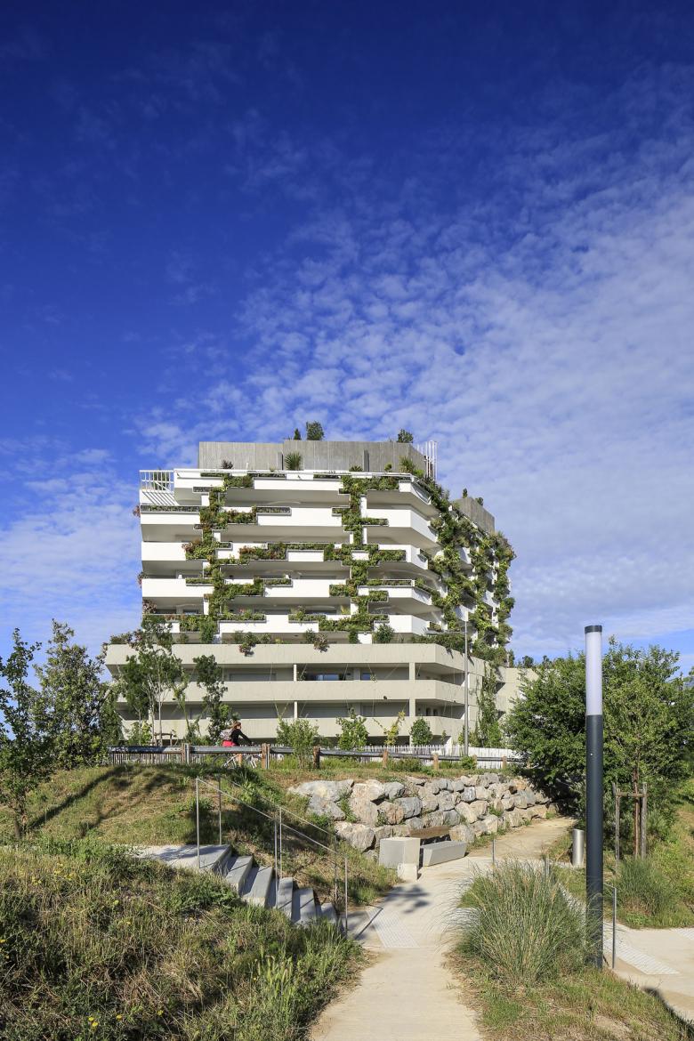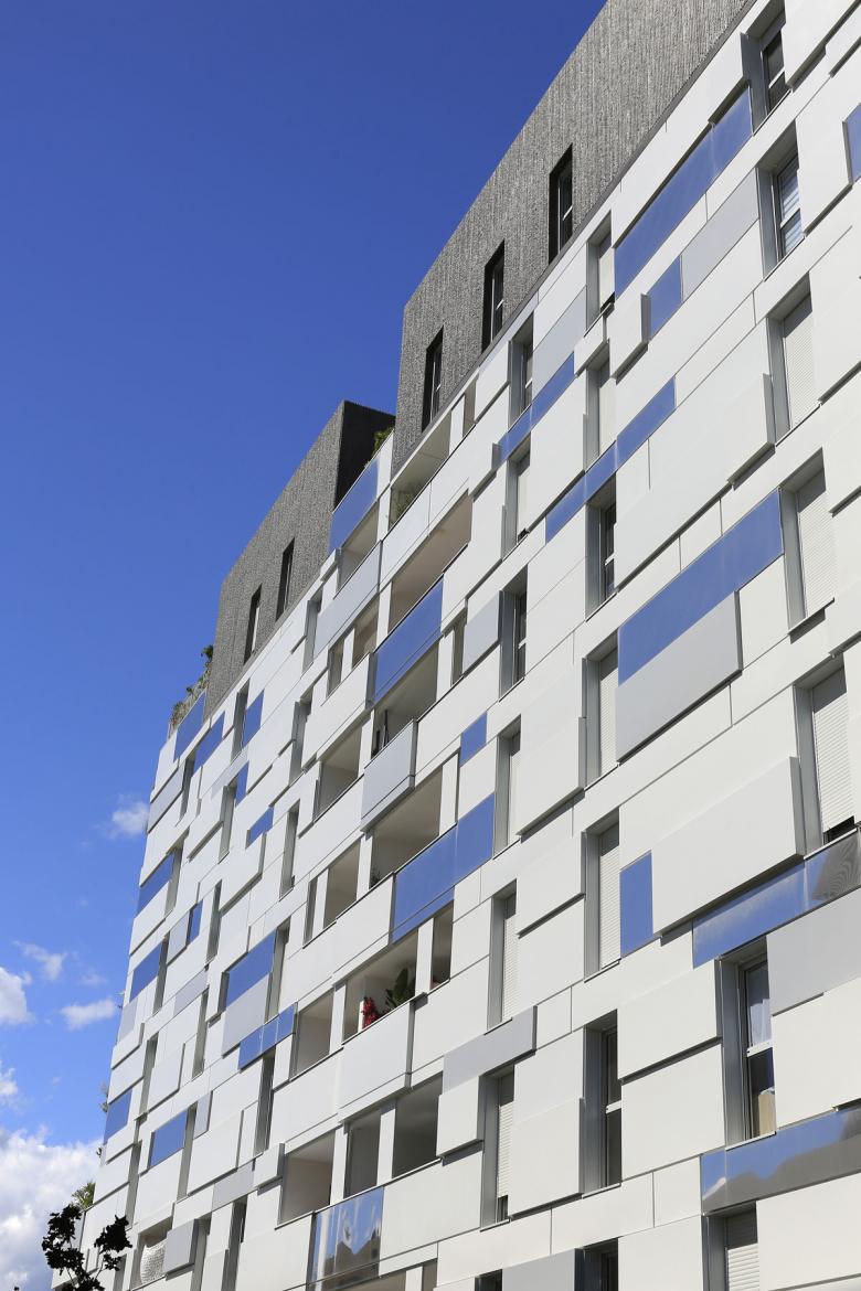 Pensé tel un monolithe stratifiée et facetté, le projet constitue un front bâti urbain dans sa limite séparatrice avec la rue. Jouxtant le site du projet, un parc public en continuité du Lez offrira des points de vue dégagés sur le fleuve et ses berges aux logements. Une bande paysagère permet une mise à distance entre espaces publics et privatifs.
