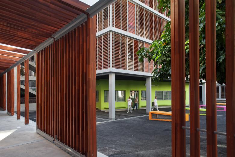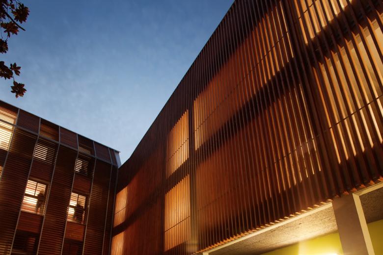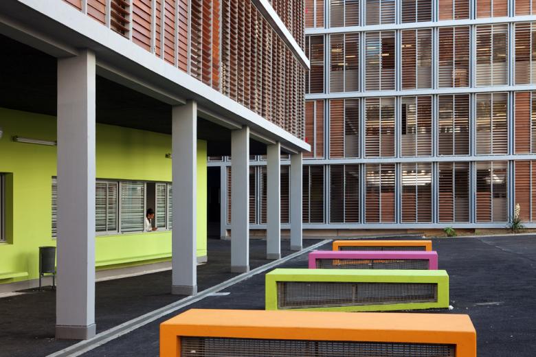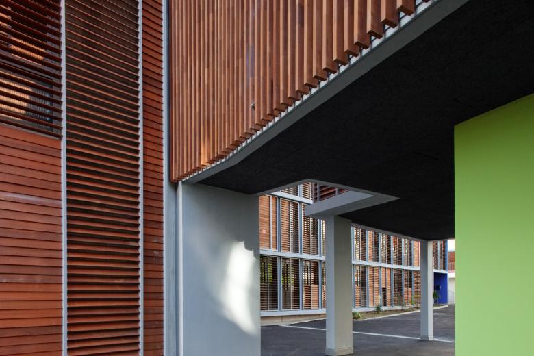 Ainsi, fort de cette contradiction, notre objectif premier a été celui de constituer une unité au site que nous avons retranscrit par une continuité spatiale - de par la nécessaire connexion des bâtiments entre eux, et ceci malgré les fortes différences altimétriques d’implantation - mais aussi continuité visuelle, afin d’offrir une véritable identité à cet établissement. Une peau unique et identitaire constituée de brise soleil en bois, vient tel un voile protecteur envelopper à la fois les bâtiments existants et les nouvelles constructions.