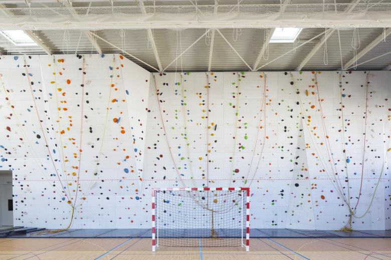 L’ambiance de la salle de sport se veut elle aussi confortable et accueillante favorisant des couleurs claires pour ne pas gêner la vision du jeu tout en fabriquant une ambiance chaleureuse grâce à l’utilisation du bois. L’apport de lumière naturelle est essentiel à un fonctionnement sain de la halle de sport, c’est pourquoi le gymnase est éclairé grâce à des lanterneaux en toiture et par la façade ajourée procurent une ambiance et des conditions de jeu optimales.