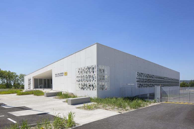 L’impact de la Halle des sports sur l’environnement immédiat est maîtrisé, épousant la topographie, le gymnase s’adapte aux contraintes de la parcelle et du programme. Cette position a pour effet d’unifier le bâtiment ainsi que de lui offrir une identité unique en résonnance avec son territoire. Cette composition prend en compte le volume entier de la Halle des sports, tous les éléments techniques sont dissimulés sous la toiture, intégrant la cinquième façade à la volumétrie générale, cette attention envers un élément souvent délaissé mais visible depuis les alentours montre la préoccupation à l’égard d’une véritable intégration.