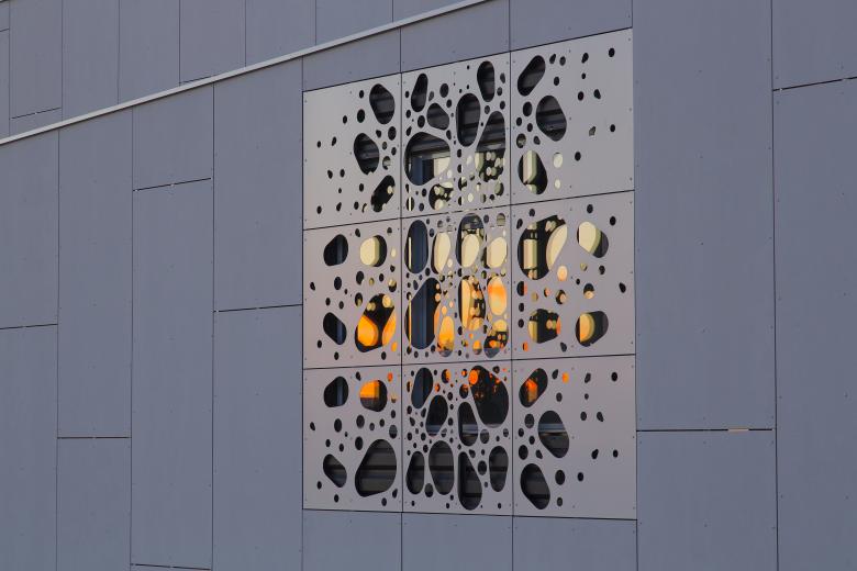 Un des enjeux majeurs de l’opération réside donc dans sa capacité à générer de l’urbanité. Ainsi le parvis joue un rôle primordial, pensé comme une place urbaine, il se veut homogène dans sa représentation, unissant les éléments piétonniers tout comme les zones de stationnement. Entièrement vitrée, l’entrée de la halle de sports offre une transversalité visuelle depuis le parvis directement vers la zone de jeux. La nuit, elle constitue un signal pour les visiteurs.