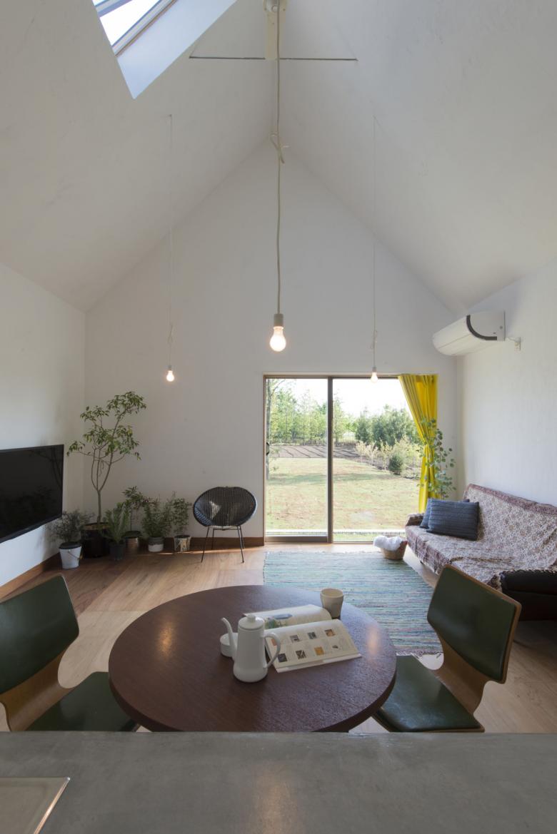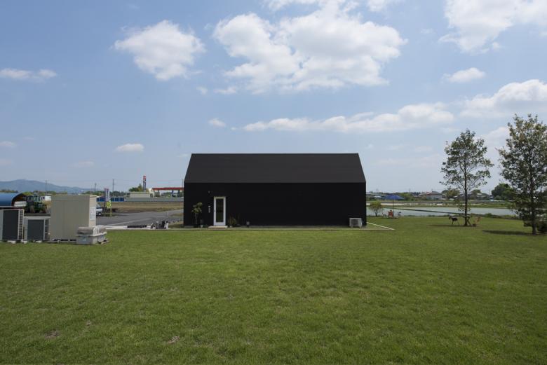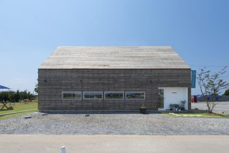 そこで、周辺との調和について考える中で、点在する農業用ビニルハウスに着目し、住宅・店舗・厨房を3つに分解した上で、ビニルハウスと同じ三角屋根とし、それらのスケールに近づき、元々あったかのような佇まいになってくれると感じた。