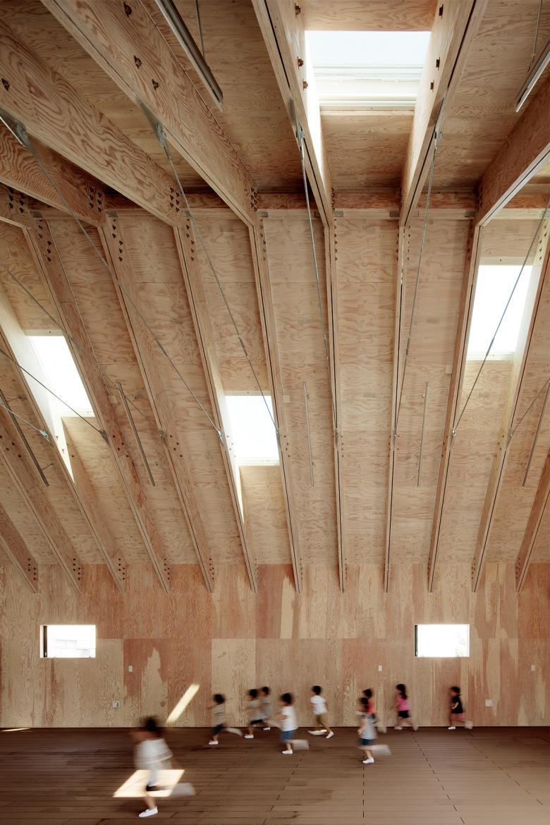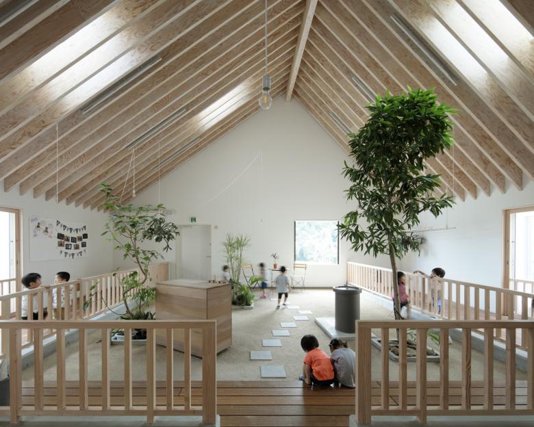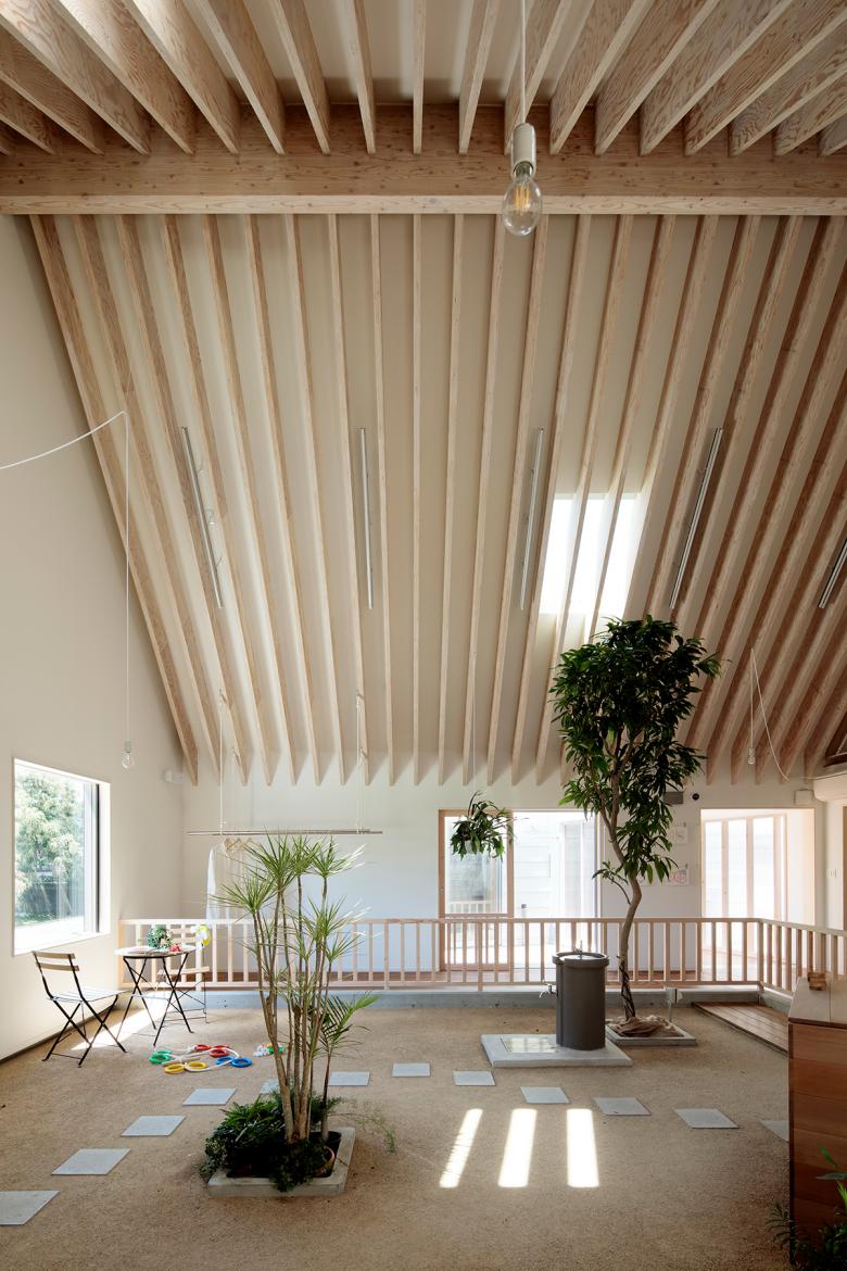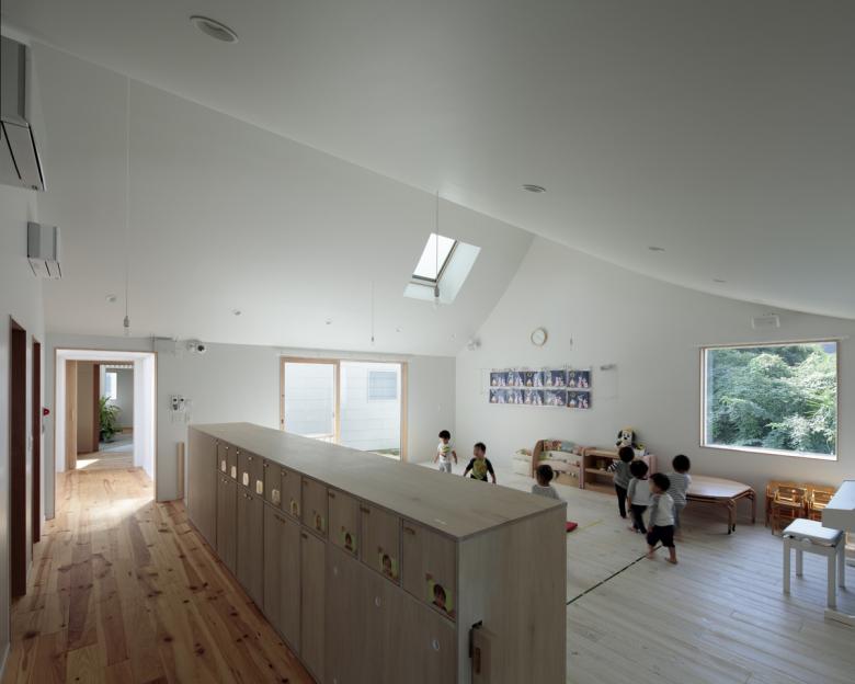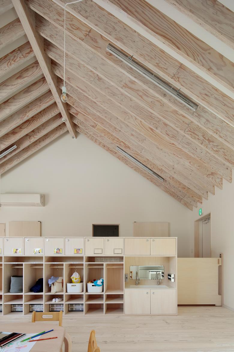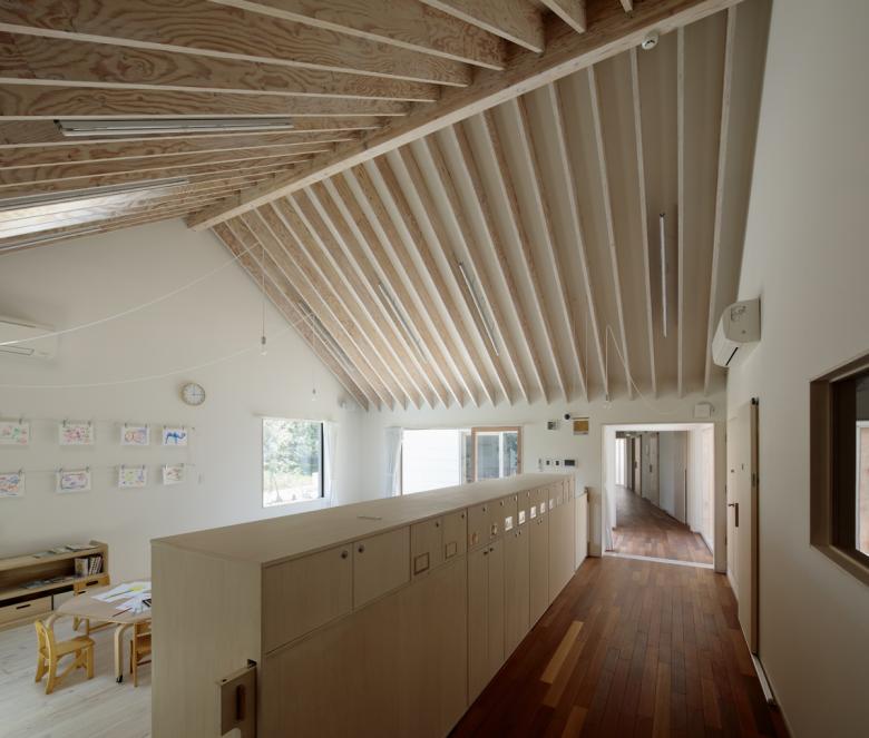 内部では、幼稚園とは違い保育園という性質上、セキュリティが重要視されるが、本園に存在する縁側を踏襲し、エントランス棟内部に配置している。雨の日であっても園児は駆け回ることができ、そして朝の混雑時も余裕をもって受け入れることができるようになる。また、渡り廊下も同じように設け、1歳児・2歳児共に、渡り廊下を介して、それぞれの教室に向かうこととなる。既存の「縁側」「渡り廊下」といった当たり前、その当たり前は学園の顔であり、卒園生の思い出でもある。