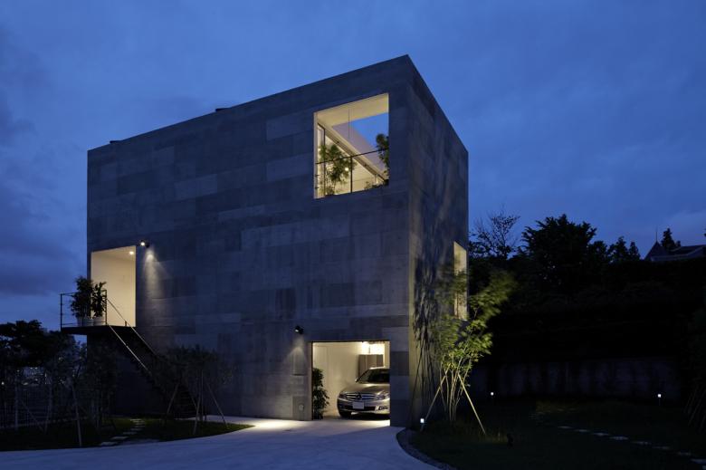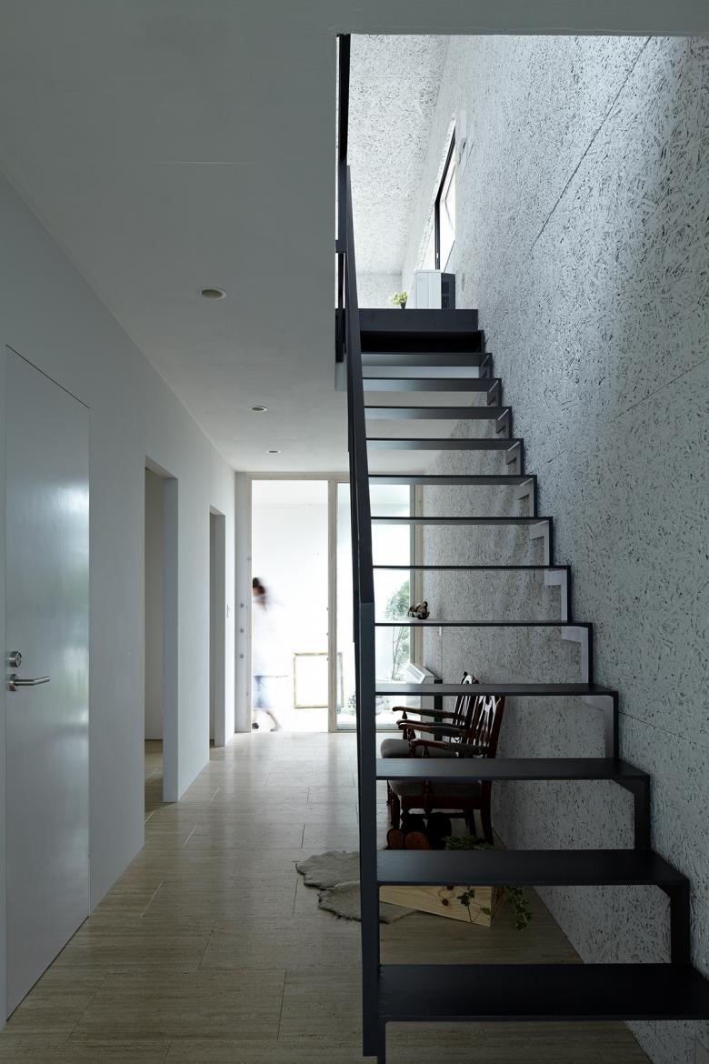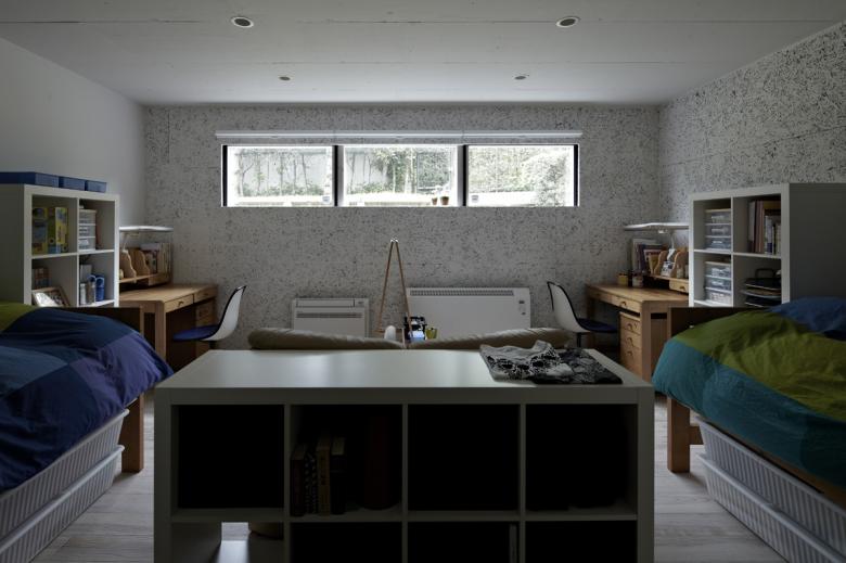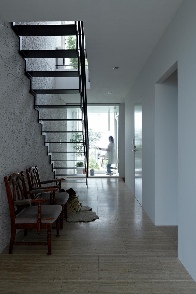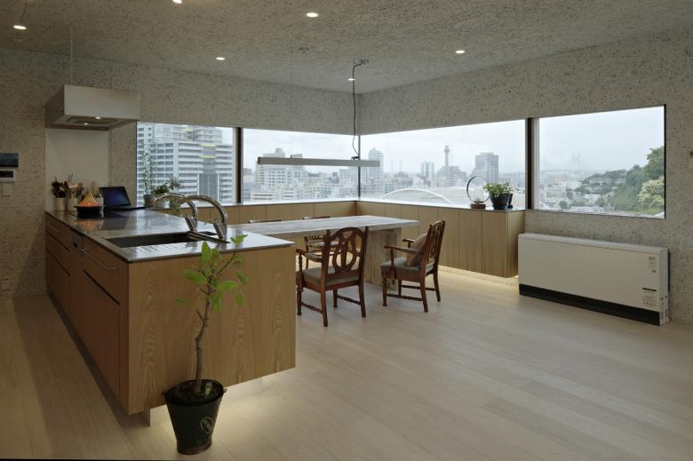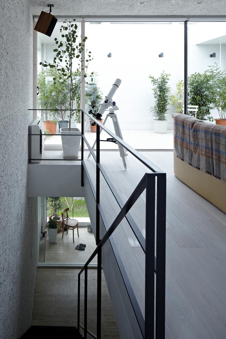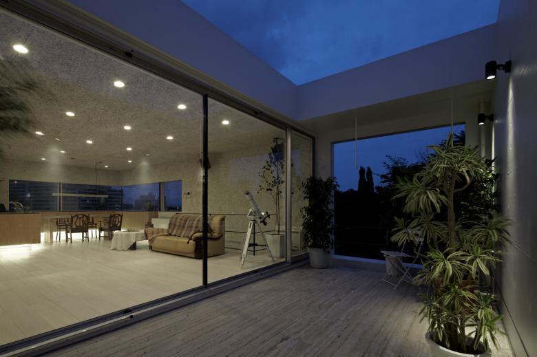 まず、視線の配慮を考慮し、壁で囲いながらもタテ・ヨコに大きな開口を開け、必要な採光と通風、眺望を得ている。