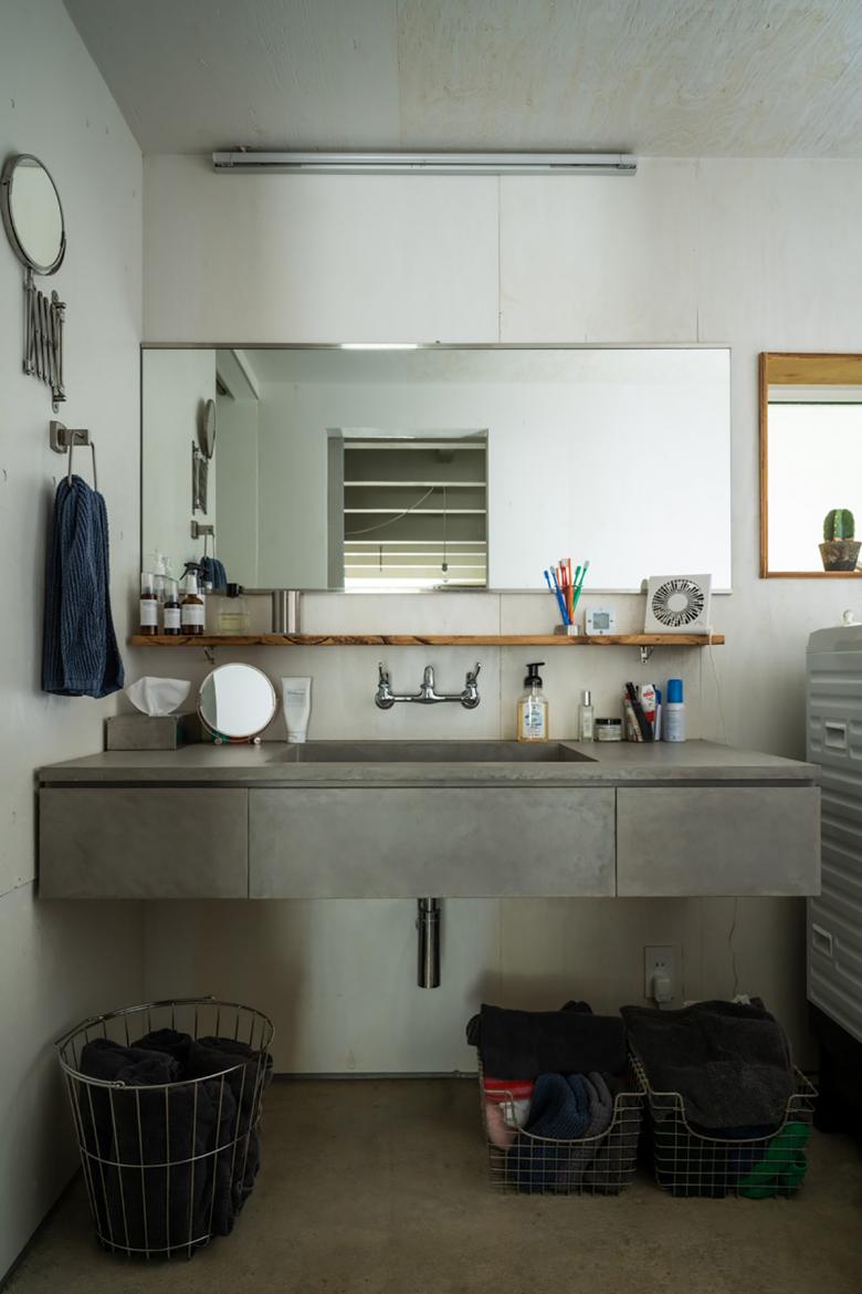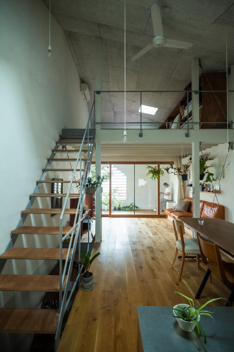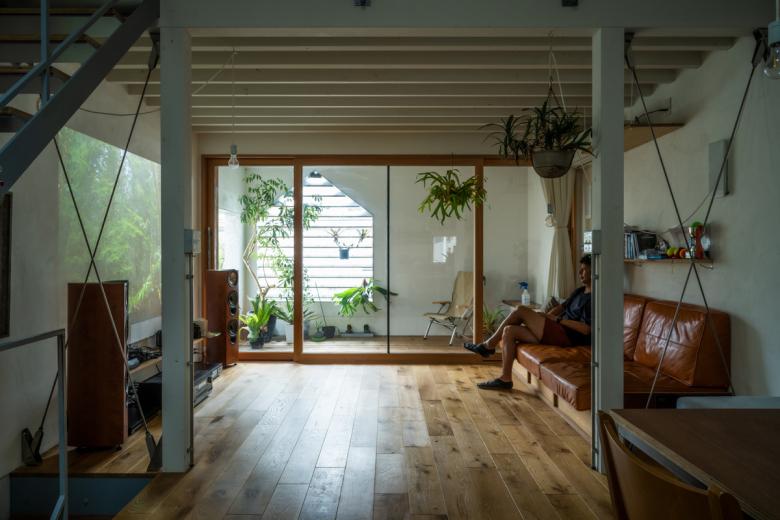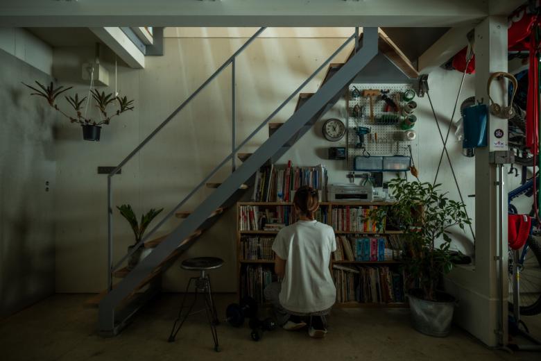 1階部分は、エントランスホールのような、倉庫のような、趣味室のような、二つ目のリビングのようなスクエアな空間があり、ここには趣味のもの、仕事のもの、衣類などミックスされながらも、それなりのルールを保ちながら収納されている。住宅密集地の中で、大らかな家族の大らかな暮らしは、少しの工夫と成熟したルールの中で、日々送られることとなる。