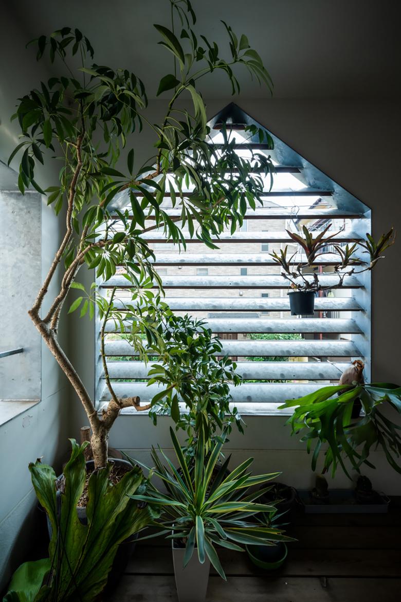 あくまで外壁でありながら、一部がガラリになり、その奥に間口いっぱいのインナーバルコニーを作ることで「閉じながら開く」を実現する。このガラリの一枚一枚のサイズ・角度・素材などの関係性によって、”いかに閉じ、いかに開くか”を原寸大のモックアップによって検討したが、組み合わせは無限にあって、ようやく納得のいく組み合わせにたどり着く。素材は、内側に反射率の高い溶融亜鉛メッキ鋼板を貼り、外部からは感じれない程の光を乱反射させながら優しい光を室内に送り込み、安心感と開放感の双方を満たしてくれる。