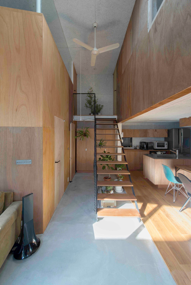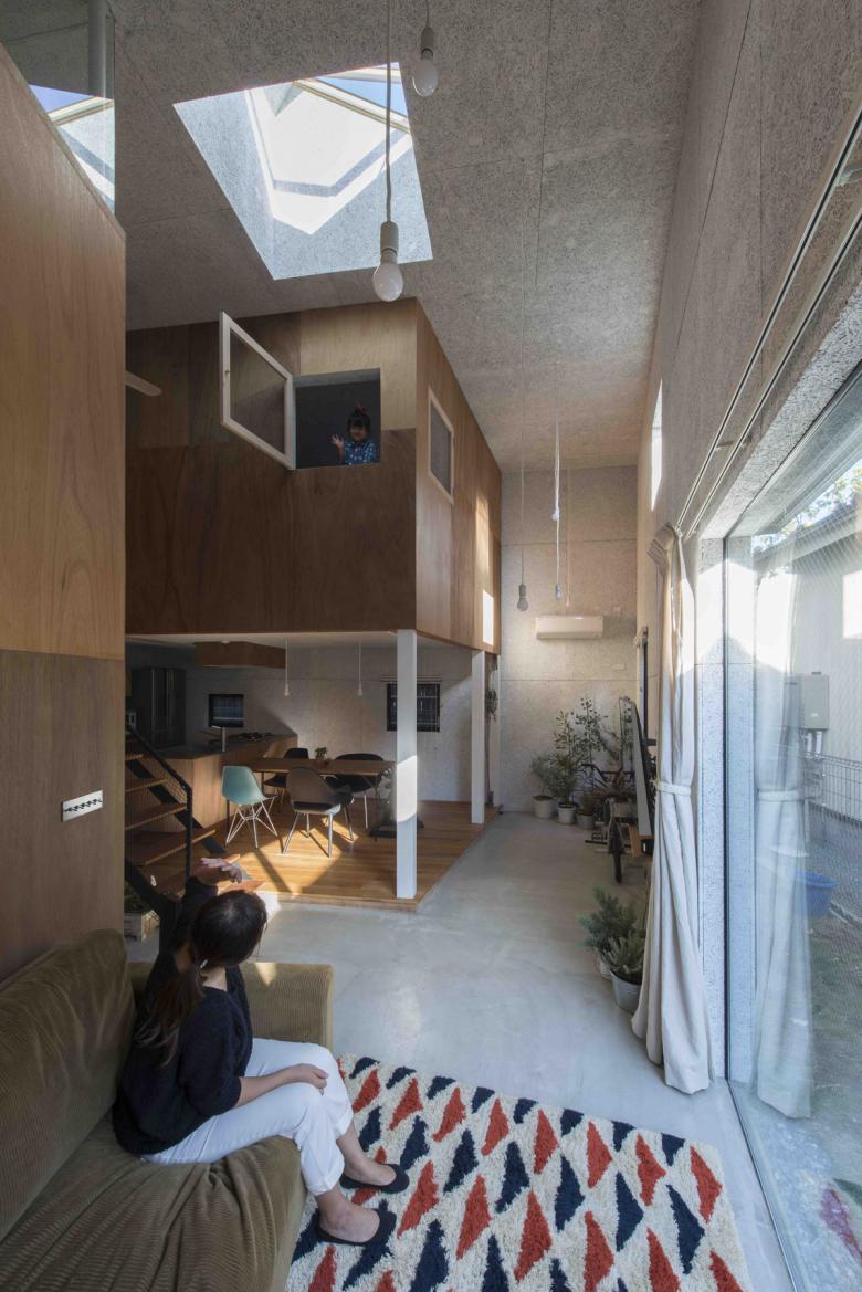木箱のないスキマスペースは2層分の吹き抜け空間となり、リビングは建物中に広がりを持つこととなる。