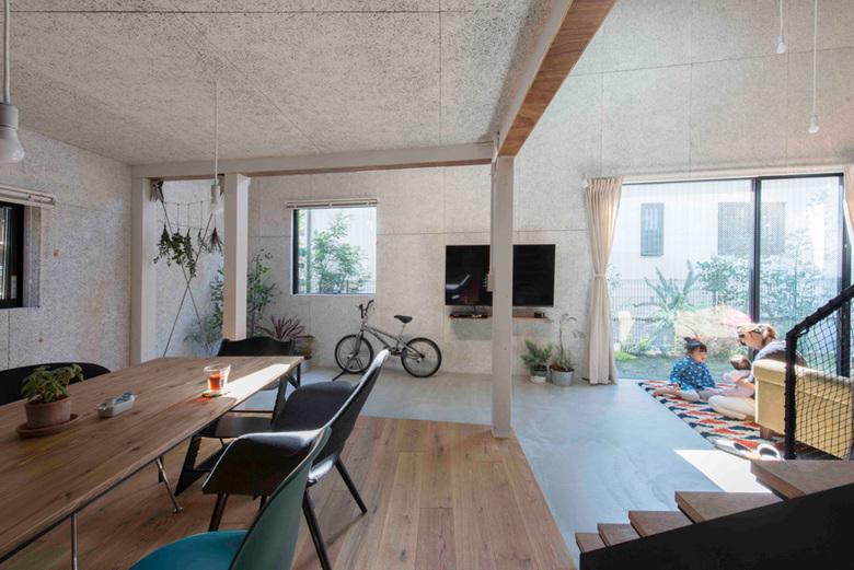 内部にもスキマ空間を作り、2つの木箱の間にできるスキマが、リビングとなり、自転車や花を置くスペースともなる。