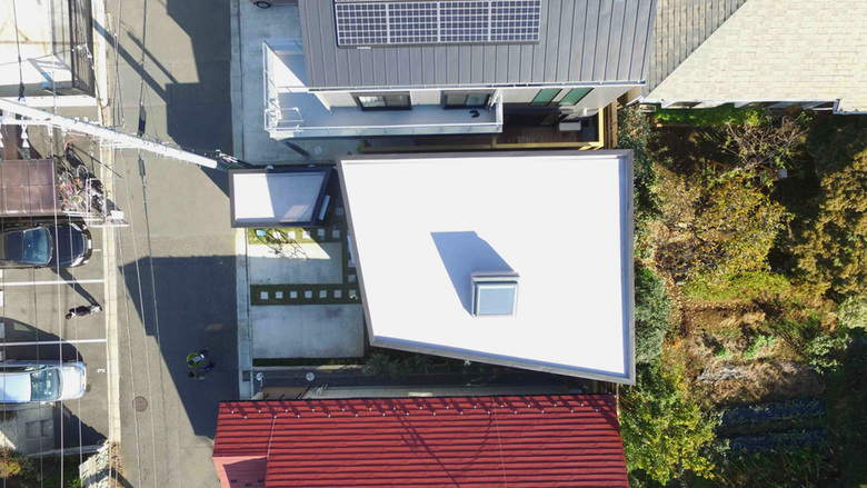 まず、建物を平面的に変形させ、残された隙間(スキマ)に、外構の庭・駐車スペース・手洗い場を生み出す。