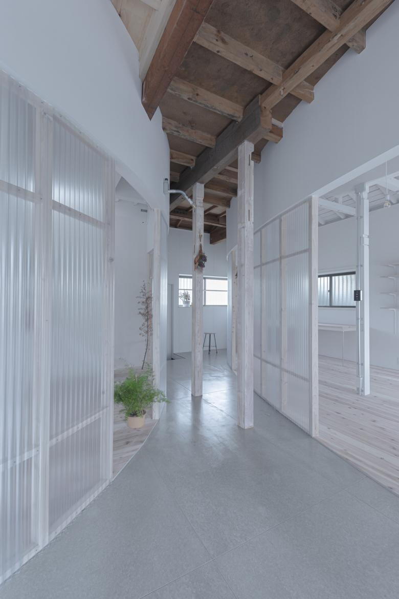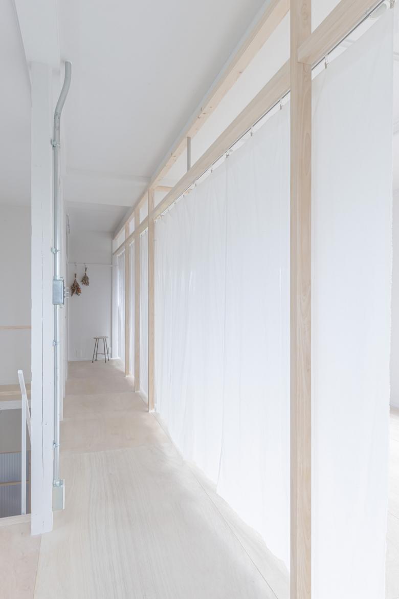 建物は昔に作られた一間モジュールのいわゆる一般的な構造であるが、外部のあぜ道(Polku)のように規則性があるようでルーズな通路を内部で横断させ、既存の構造を感じさせない自由な空間としている。