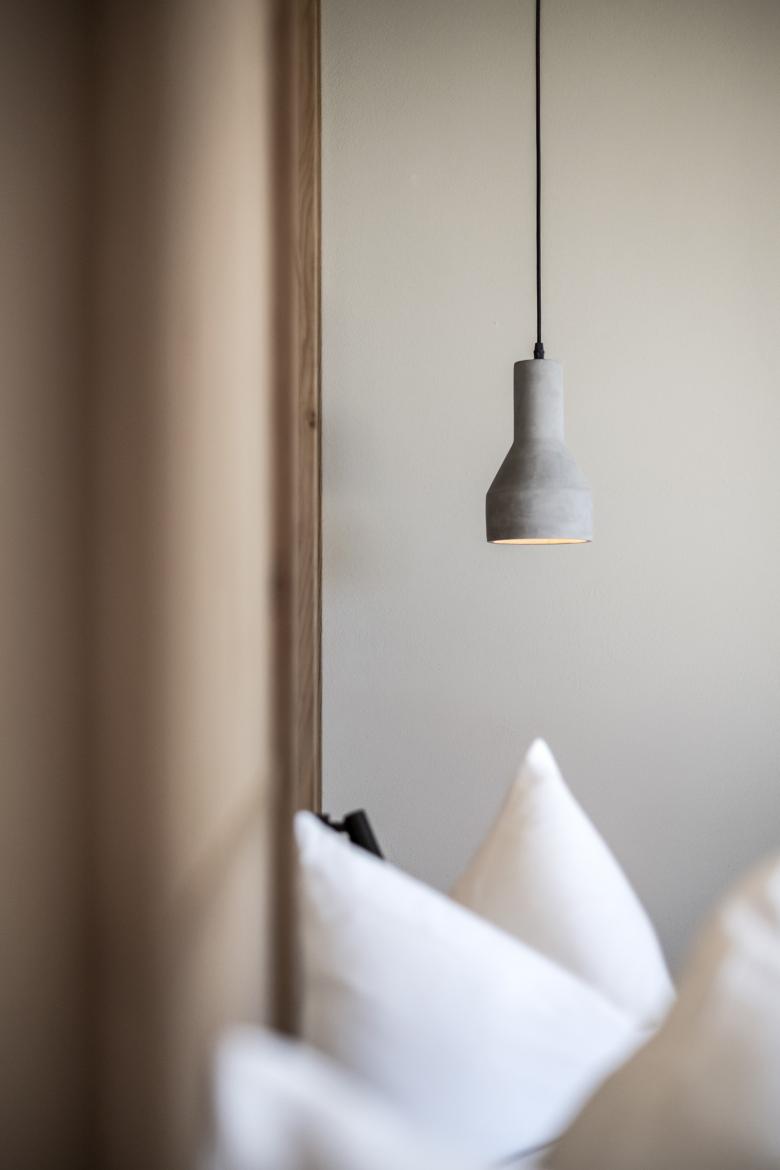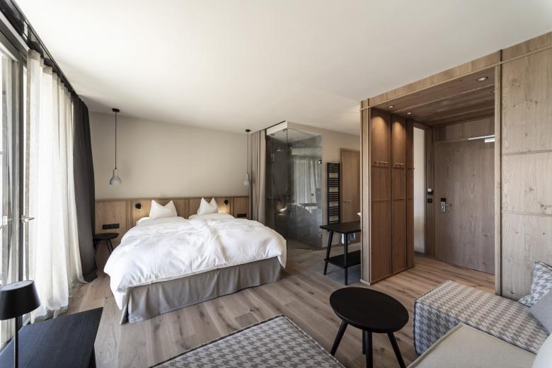 Going down a staircase from the barn, we enter the lower level which provides access to the new rooms; all of the rooms are the same on both levels (-1 and -2) and are amazing in terms of their features and size. On entering, a wooden entry-type hall (concealing the wardrobes) leads to a bright, open space (25 square metres). The model is that of the suite, with an open bathroom area (except for the toilet and bidet) designed with stone-effect tiles which break up the colour uniformity of the durmast wood chosen for the flooring in the room, whilst a white ceramic vessel sink revokes the traditional country basin in terms of its shape. All the furniture is custom designed in light and natural tones. But most importantly, in each room there is a huge glass window (measuring 4.8 metres in length) that coincides with the façade, showcasing a thrilling view. "There's nothing in front of us, only pine forests, pastures and mountains", notes the architect Profanter. The room is complemented by a terrace, featuring wooden flooring (on level -2 it directly borders the lawn) which provides more living space.