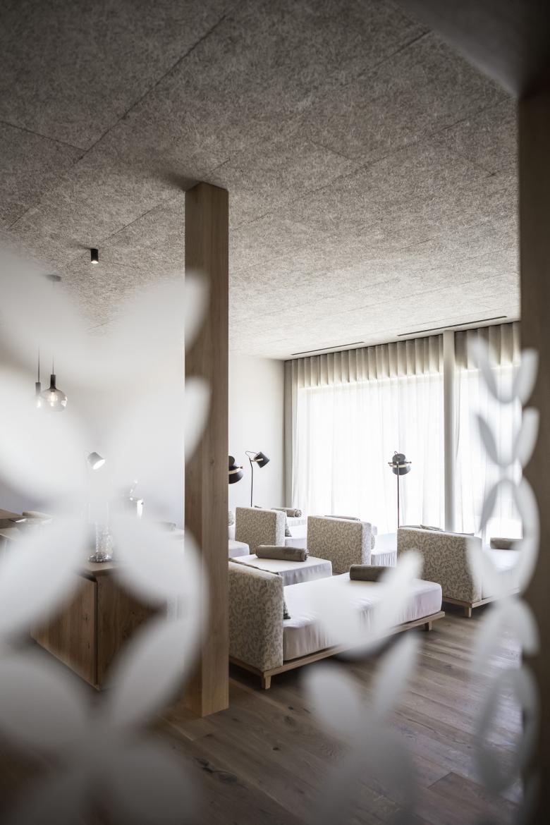 The wellness area, which is also on level -1, also shares the splendid view with the rooms, extending out onto wooden terraces where guests can sunbathe or simply relax in the warmer months. Inside, 6 cabins create fully wooden-cladded mini-rooms for individual use, allowing guests privacy and tranquillity whilst they lie down on a soft mattress that is submerged into the flooring. Custom-designed chaise lounges round off the decor. In the wellness area there is a Finnish- and bio-sauna (the latter with a lower temperature), which have a panoramic glass window.