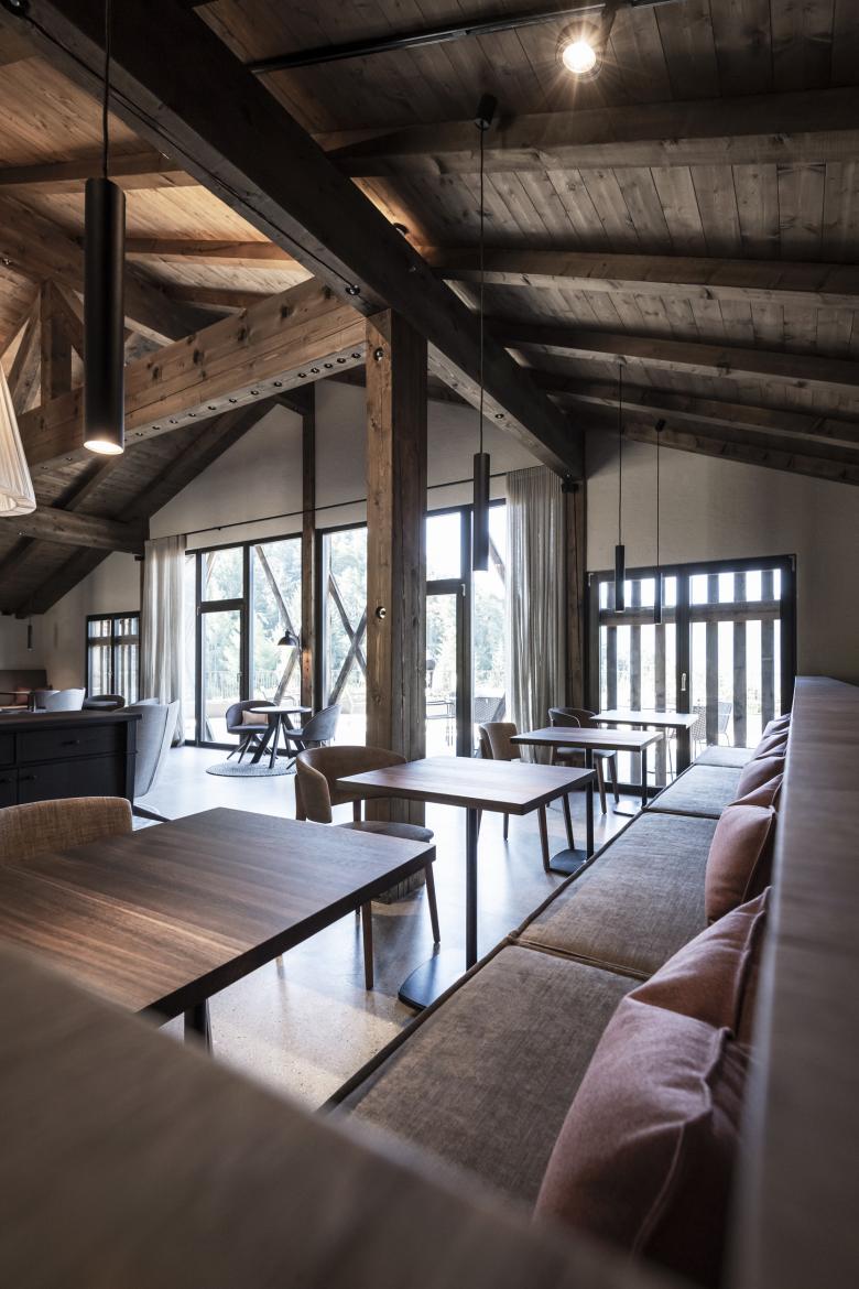 It is meaningful that access to the new spaces takes place through an old barn which sits by the restaurant. The outside of the building has preserved its traditional look thanks to careful restoration works, but the inside holds a surprise for visitors: it has been fully converted to host the hotel's reception, a lounge and breakfast hall within one large open-space area.