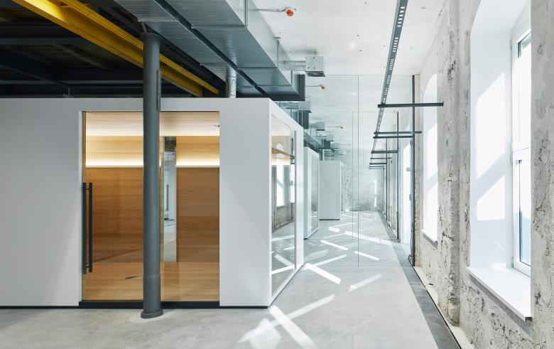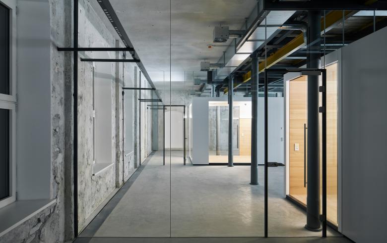 Die neuen Büroeinheiten sind durch großformatige Ganzglaswände voneinenander getrennt, jede der sechs Einheiten besitzt eine Holzbox als Rückzugsbereich. Die innen komplett in Eiche ausgekleideten Holzboxen sind außen in weißem Schleiflack ausgeführt, wodurch sich ein starker Gegensatz zwischen „alter Hülle“ und „neuen Einbauten“ ergibt.