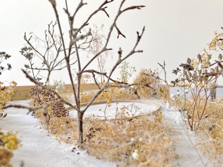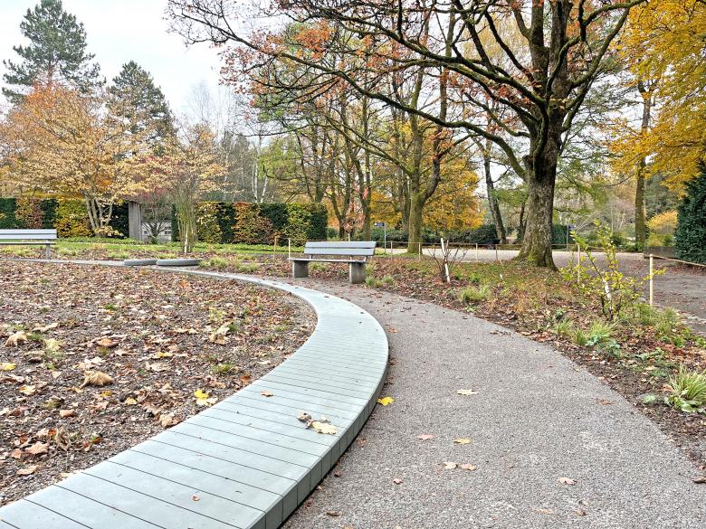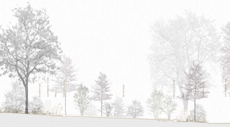 Das neue Gemeinschaftsgrab wird gesäumt von hochgewachsenen malerischen Bäumen. Die Wiese wird räumlich zur Lichtung und ist gezeichnet durch ein kreisförmiges Natursteinband. Die Mitte, in der die Bestattung stattfindet, zeichnet sich durch einen nicht begehbaren Blumenrasen aus. Um den kreisförmigen Bereich unter den Gehölzen wachsen artenreiche Gräser mit vielfältigen Wildstauden. Mehrstämmige Blütengehölze bilden einen niedrigen Horizont. Da sie auf Augenhöhe wachsen, entsteht ein geschützter Trauerraum, ein Ort ohne aufgeladene Symbolik.