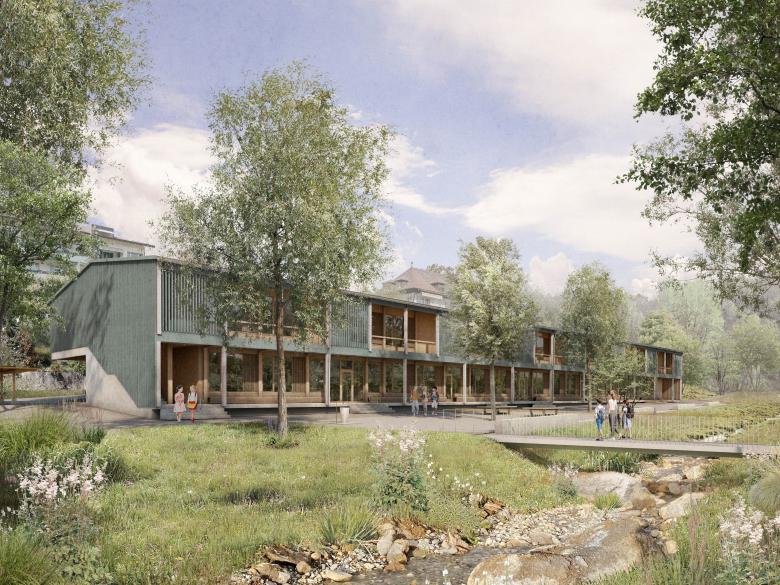 Im weiten und ausgedehnten Grünraum zwischen Egelsee und Zentrum Paul Klee liegt das Projekt Stadtteilpark Wyssloch. Die stadteigenen Parzellen mit 25`300 m2 befinden sich zwischen Egelgasse und Laubeggstrasse. Das aus einem offenen Wettbewerb im Jahr 2019 hervorgegangene Projekt besteht aus einem Park, einer neuen Volksschule und einer Tagesschule. Letztere wird im bestehenden und zu sanierenden Wysslochgut integriert. Bereits heute bildet der Grünzug einen wichtigen Erholungsraum mit einer bereichernden Identität und Atmosphäre im Quartier. Bestehende Nutzungen werden zukünftig erhalten, neu geordnet und ergänzt. Im Stadtteilpark werden die beiden schulischen Angebote in ein harmonisches Gesamtkonzept zusammengebunden und bilden ein qualitätsvolles Ensemble der `Schulen im Park`. Stadtgärten, Sportplatz und die Pumptrack-Anlage werden innerhalb des neuen Freiraums integriert. Die veränderte Wegeführung erschliesst die neuen Schulaussenräume und sorgt für eine Durchlässigkeit innerhalb des Parks. Zwei Hauptwege mit bachquerenden Brücken über den offengelegten Wysslochbach führen durch den Stadtteilpark. Ein Aussichtspodest befindet sich innerhalb des artenreichen Feldgehölzes, welches mit hohen und niederen Sitzelementen einen weiten Überblick über den Stadtteilpark erlaubt. Die bestehenden Stadtgärten am nordwestlichen Parzellenrand werden auf die gegenüberliegende Seite verlegt. Formschnitthecken umrahmen das Gartenareal. Querende Wege dienen der Durchlässigkeit und streben eine neue Kleingartentypologie an. Platzartige Flächen innerhalb der Gärten werden mit Sitzbänken und Gartenbrunnen ausgestattet. Ausgewählte, schattenspendende Obstbäume unterstreichen die Nutzgartenidee. Neben den Pachtgärten wird ein Gemeinschaftsgarten mit einem Materialhaus ergänzt.