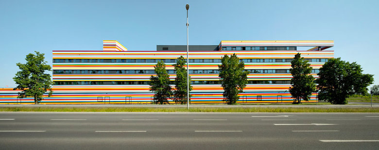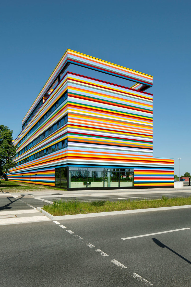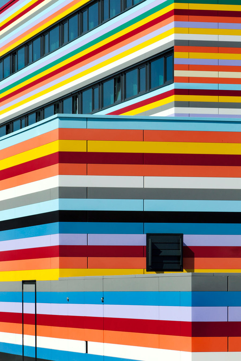 Was wir sehen ist nicht die Hülle als Fassade eines Hauses, sondern das „Bild“ einer Fassade – eine abstrakte Komposition, mit der sich das Haus einer eindeutigen Zuordnung (Gebäudetyp + Nutzung) entzieht und statt dessen den Passanten irritiert und zu einem eigenen Abstraktionsprozess auffordert. Die angebotene Farbkarte des Herstellers schien uns nicht ausreichend, dieses Ziel zu erreichen. Deshalb wurden zusätzliche Farben (Sonderfarben) erforderlich, die wir aus unserer Codierung abgeleitet haben. Die Farbbeschichtung („matt“) ist durch ihre Oberflächenstruktur nahezu selbstreinigend, sie ist UV-stabil, reflexionsfrei und bei allen Witterungsverhältnissen farbintensiv + unterstreicht besonders den Abstraktionsgrad. Die Kooperation mit Thyssen-Krupp war zu jeder Zeit unkompliziert, unterstützend und interessiert – auch zu einem Zeitpunkt, als das System neu und die Kosten noch nicht offiziell kalkulierbar waren.