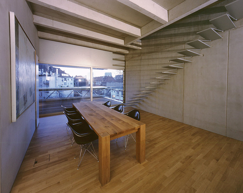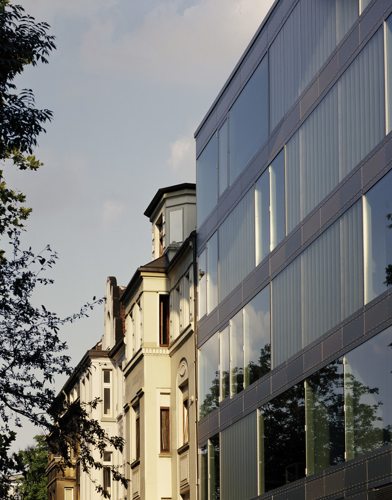Das Quartier am Ostwallmuseum ist in seiner heutigen Ausprägung zu Beginn des 20. Jhdt. innerhalb des historischen Wallrings entstanden. Seitdem ist es gekennzeichnet durch Wohnen und intensiver Durchmischung kleiner Einzelhandelsflächen. So konnte unmittelbar neben der Kernstadt ein suburbanes Milieu entstehen, das seit den 60-er Jahren bis in die 90-er Jahre des 20. Jhdt. vorwiegend durch gastronomische Vielfalt überregionale Bedeutung gewonnen hatte. Das Haus befindet sich an strategisch günstiger Position zwischen den Gerichtsstandorten Amtsgericht, Landgericht und Arbeitsgericht, die alle komfortabel fussläufig erreichbar sind. Dies vorausgeschickt liegt der „Olpe 39“ die Idee des Speichers (Storage-System/ virtueller Speicher/ gestapelter Stadtraum) zugrunde. Die Fassade übersetzt diese Idee als „Macro-Chip“. Er signalisiert unterschiedliche Synapsen in Form differenzierter Gläser, die transparent oder transluzent sind. Die Innen-Außen-Sichtbeziehung wird durch transluzente Fassadenanteile fokussiert - der Außenraum, Park und Bäume, werden als raumhohe Images in das Gebäudeinnere implementiert - sie füllen die Fassadenfläche als Bilder (unbehindert durch Fassadenprofile, Absturzsicherungen, Lüftungsflügel/ Heizkörper). Der Blick bleibt pur. Das Grundstück ist vollständig überbaut. Die umgebenden Nachbarn konventionell unterfangen, in den verbliebenen städtebaulichen Hohlraum wurden Decken gestapelt - ausschließlich an den Außenwänden aufgelagert. Alle Geschoßebenen sind stützenfrei. Damit entstehen frei teilbare Grundrisse ohne Nutzungsdeterminierung. In diesem urban-storage sind differenzierte Nutzungen quasi durch „Möblierung“ eingeschoben - Restaurant, Büro oder Wohnen basieren auf den immer gleichen konstruktiven und technischen Bedingungen.