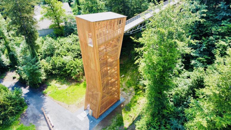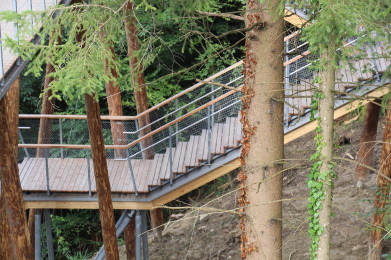 Der 350 Meter lange Schlaufensteg im Wald des Lorzentals wurde zur Überwindung des Höhenunterschiedes am Hang gebaut und dient als direkte Fussgängerverbindung zwischen Buebegunte und Vogelwinkel. Der Steg ist auf einer Höhe zwischen 3 und 22 Metern oberhalb des Waldbodens erbaut und besteht aus zwei Türmen, einer Brücke sowie Treppen mit insgesamt 265 Stufen. Der Ein- und Ausstieg dient mit einer Aussichtsplattform als Anziehungs- und Aussichtspunkt. Die Rundholzstützen stammen von Nadelhölzern aus dem Waldgebiet der Korporation Baar. Sie sind auf Mikropfählen 10-15 Meter tief im Waldboden verankert und pflegen sich hervorragend in den Wald und die umliegende Natur ein. Besonderes Augenmerk lag auf der Entwicklung einer dauerhaften und witterungsresistenten Konstruktion für Holz in anspruchsvollen klimatischen Bedingungen. Diesem Objekt wurde das Label «Schweizer Holz» verliehen.