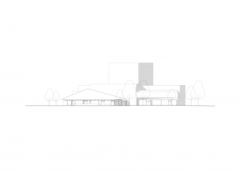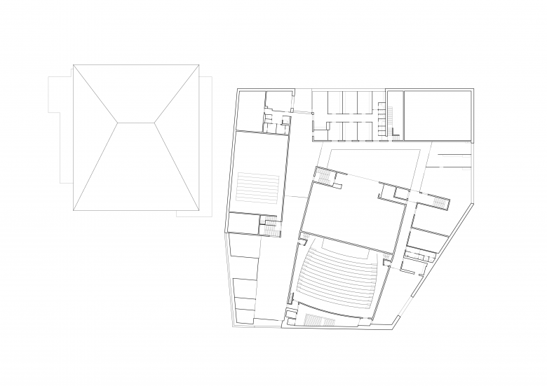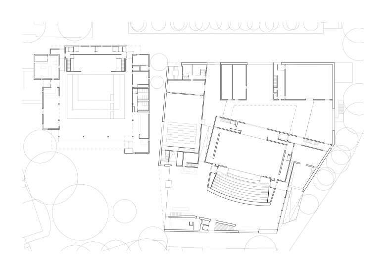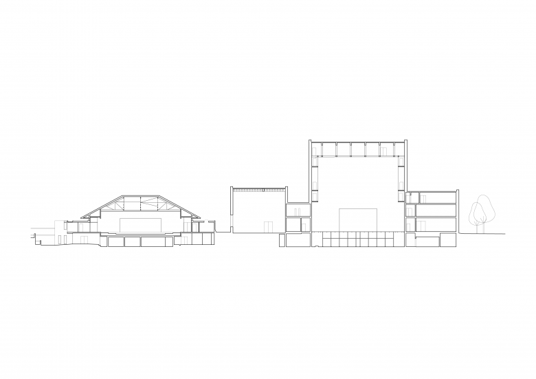 A l’échelle du site, le projet compose cinq grandes pièces du programme (trois nouvelles salles, salle des fêtes existante, esplanade d’entrée) en exploitant leurs interstices pour définir les circulations intérieures et extérieures. Côté public, le foyer s’ouvre complètement sur l’esplanade tandis qu’à l’arrière la halle de montage forme une cour intérieure regroupant les scènes et les ateliers de décors. Le premier étage est consacré au travail avec ateliers, bureaux, salles de réunion, loges et régies distribués par un parcours circulaire.