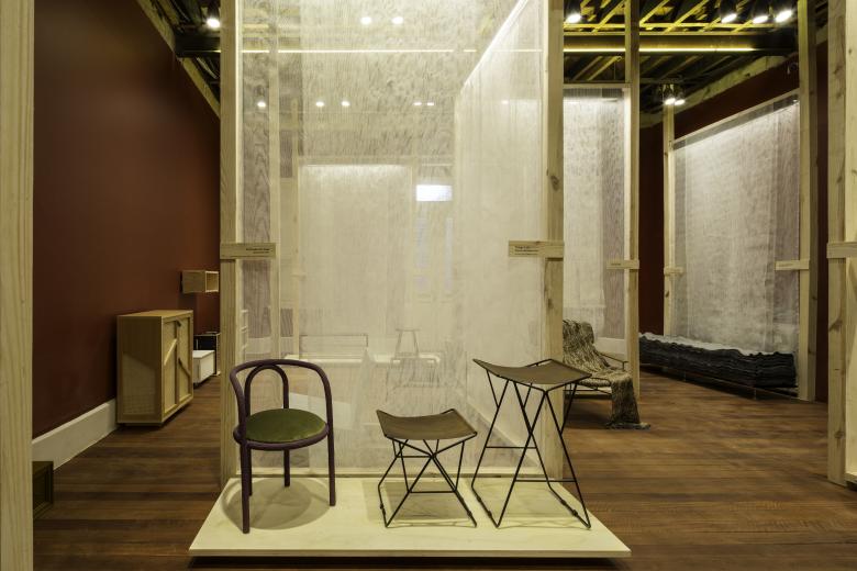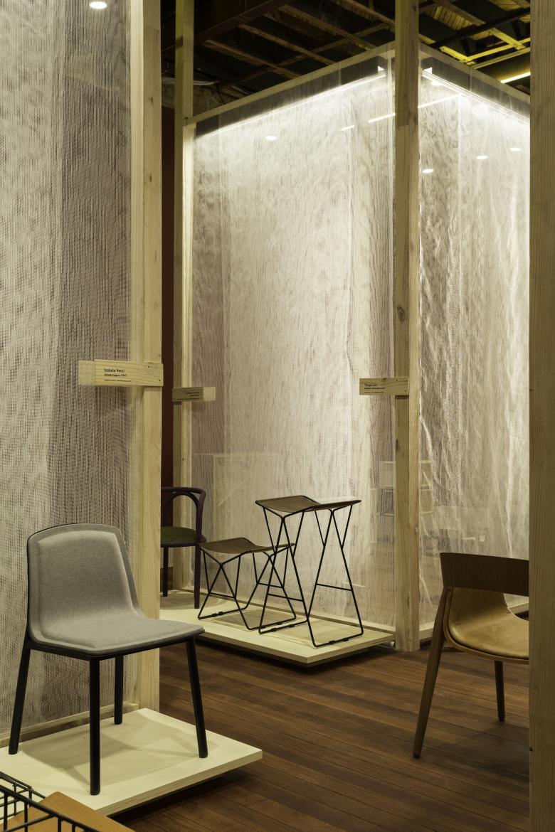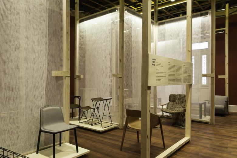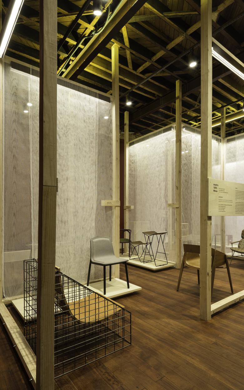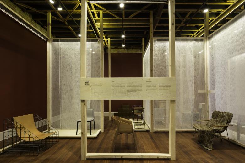 100% Minas is an exhibition that seeks to present the brand new production of furniture designers based in Minas Gerais. Its expography seeks references in common elements of civil works: wooden post shores and facade screens. Although part of the construction process of any building, such cheap, temporary components never remain and are rarely considered as elements of final architecture.