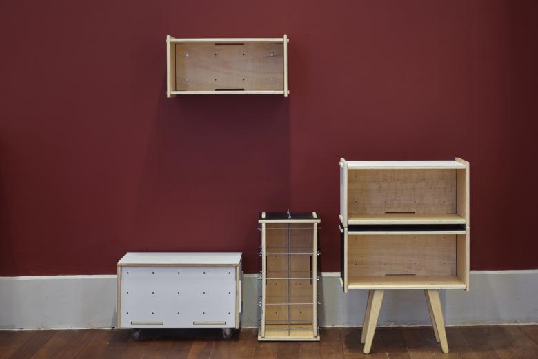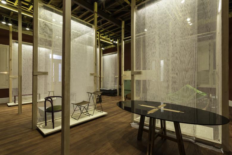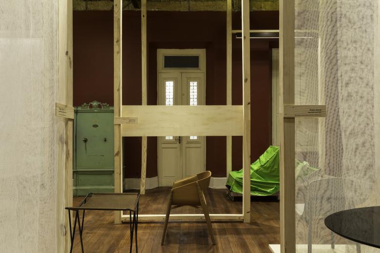 The pinus posts serve to delimit, albeit subtly, the compartmentalization and circulation around the room. Arranged in a regular 2×2 meters grid, they suggest possibilities of circulation, structure the arrangement of the objects and at the same time exalt the bars of the ceiling, on which the posts are fixed. Joining them as if in a translucent labyrinth, the planes formed by the screens define the many ambiences of the room.