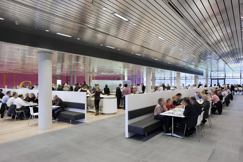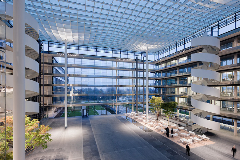 Herz des Hauses ist das 40 × 40 Meter große transparente Atrium. Von dort gelangt man mit Panoramaaufzügen zu den Arbeitsplätzen in den drei U-förmigen Bürofingern. Im Erdgeschoß liegen der Empfang, ein Konferenzzentrum und das Casino.