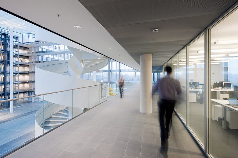 Eingebettet in einen grünen Landschaftsteppich bietet das aufgeständerte, sechsgeschoßige Bürogebäude moderne, ökologische und freundliche Arbeitsplätze für 1800 Mitarbeiter. Wichtig bei der Planung war ein minimaler Energie- und Ressourcenverbrauch.
