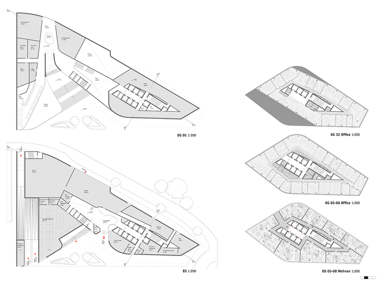 Die Hochhaustypologie entspricht einem multifunktionalem Sockel und einem monofunktionalen Turm. Das Sockelgebäude incl. Vorplatz erstreckt sich terrassenförmig über das gesamte Grundstück.