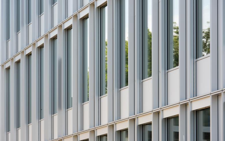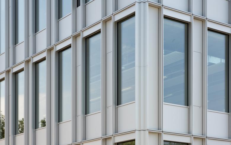 Als Gebäudehülle wurde eine Elementfassade aus Aluminium und Glas entwickelt, die der geometrischen Ordnung des Stahlbetonskelettbaus folgt. Nord- und Südfassade bestehen aus Kastenelementen mit einem auf das Gebäuderaster abgestimmten Achsmaß von 2,34 m. Dieses gliedert sich in einen horizontalen, opaken Brüstungsbereich und einen vertikalen Teil mit schmalem opakem Lüftungsflügel und breiterer Festverglasung im Verhältnis 1/3 zu 2/3. Auf der Ostfassade wird dieses System aus Kastenelementen mit einem engeren Raster (je 1/3), variiert. Grundsätzlich folgt die Planung und die Ausführung den Prinzipien des nachhaltigen Bauens (BNB silber) mit einer hochwärmegedämmten Hülle und robusten Baumaterialien. Durch die Energieversorgung aus nachwachsenden Rohstoffen folgt die Planung der Zielvorgabe EnEV minus 20%.