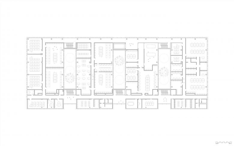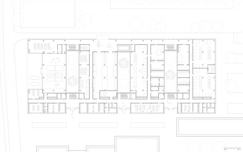 Das BTZ ist in vier Riegel gegliedert, verbunden durch drei Innenhöfe. Durch die Kompaktheit des Baukörpers und die Stapelung der Nutzungen gewinnt die Handwerkskammer auf ihrem Campus ein hohes Maß an nutzbarer (Ausbildungs-) Fläche. Darüber hinaus entstehen durch die Setzung des Baukörpers qualitätvolle Außenräume für Pausen und Veranstaltungen. Das neue Ausbildungszentrum beherbergt hoch installierte Lehrwerkstätten, ein Zentrallager, Seminar- bzw. Unterrichtssäle sowie Nebenräume für die Auszubildenen und Meister. Die ablesbare Gliederung des Baukörpers in „Köpfe“ und „Körper“ folgt der inneren Organisation des Gebäudes: In den (Bau)Körpern sind die Funktionseinheiten der Werkstätten untergebracht, die u.a. über die Innenhöfe natürlich belichtet werden. Die Köpfe beherbergen die ergänzenden Räume, u.a. Umkleiden und Büros. Die Typologie ermöglicht eine logische Trennung der Wege von Lernenden und Lehrenden im Osten sowie der Logistik im Westen, wo sich auch die Anlieferung befindet.