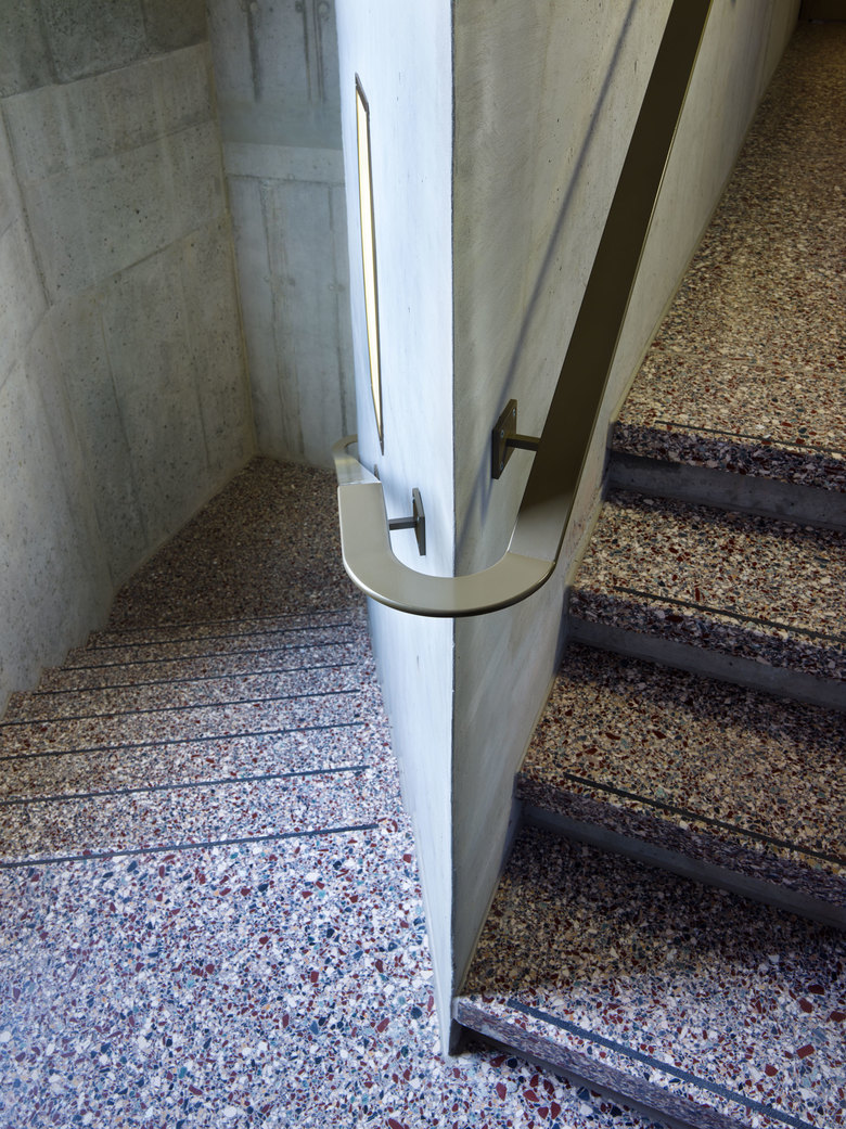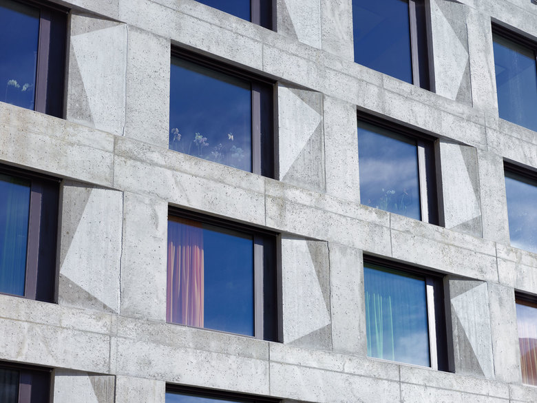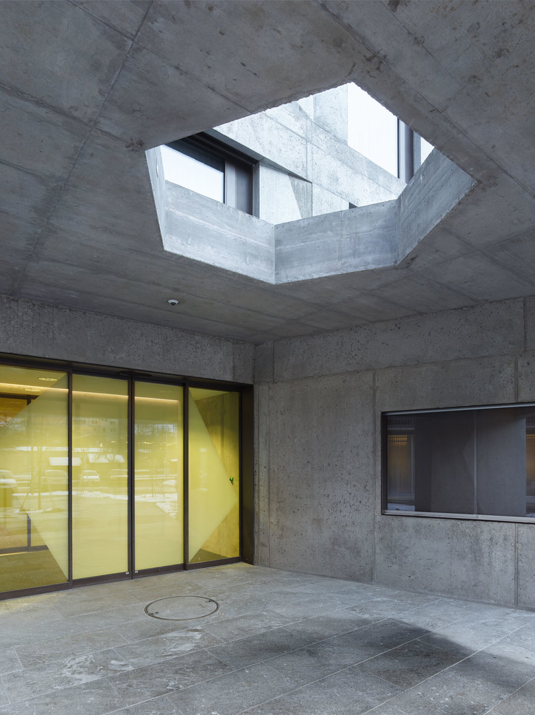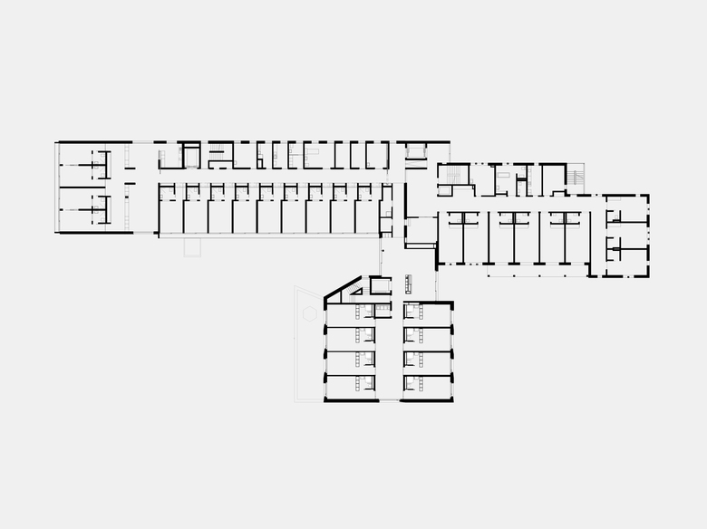 Die Erweiterung, die in der Mitte des Längsbaus platziert ist, optimiert die Verkehrswege und schafft innerhalb des Ensembles einen neuen Schwerpunkt: Im Erdgeschoss des Neubaus ergänzt ein Tageszentrum die bestehende Cafeteria. In den Obergeschossen wird der Aufenthaltsraum zwischen Alt- und Neubau zum neuen Begegnungsort für die Bewohner. Die Zimmer werden in einer zweibündig erschlossenen, ost-west-gerichteten Anlage organisiert.