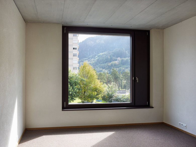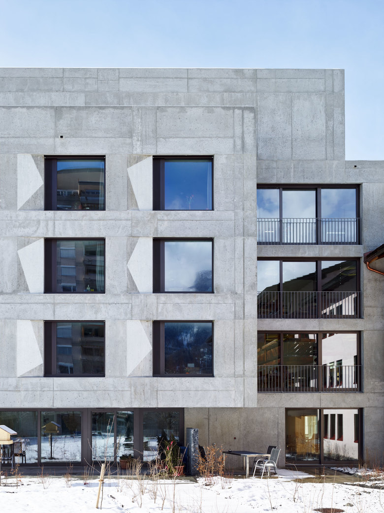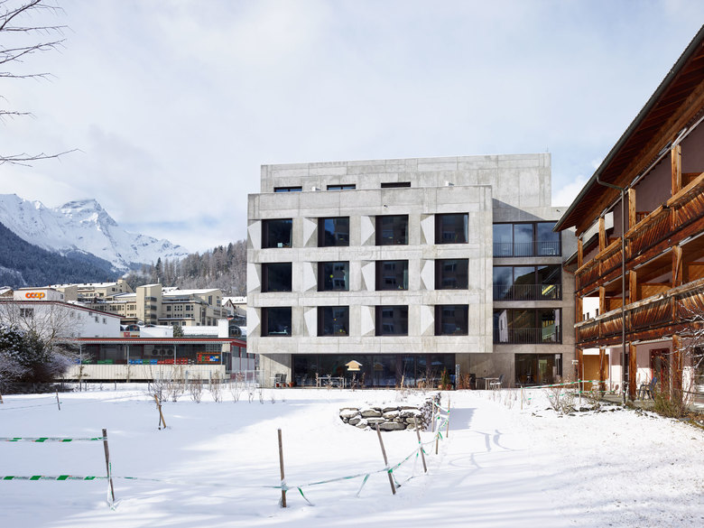 Das Pflege- und Altersheim liegt in der Talsohle von Thusis nahe des Hinterrheins. Das bestehende Gebäude aus den 1980er-Jahren, das 2004 erweitert wurde, hebt sich in Typologie und Ausrichtung deutlich von der Bebauung des Quartiers ab: Die Längsbauten des Ensembles bilden einen räumlichen Abschluss zur weiten Ebene des Domleschgs und schaffen einen Übergang zur dichteren, kleinteiligeren Struktur im Süden. Ein punktförmiger, solitärer Neubau stärkt das Thema des Vermittelns: Er schafft einerseits einen Bezug zu den Wohnhochhäusern im Südosten und begrenzt andererseits den langgezogenen Aussenraum, sodass zwei unterschiedliche Freiräume mit jeweils spezifischen Qualitäten entstehen.