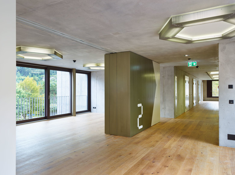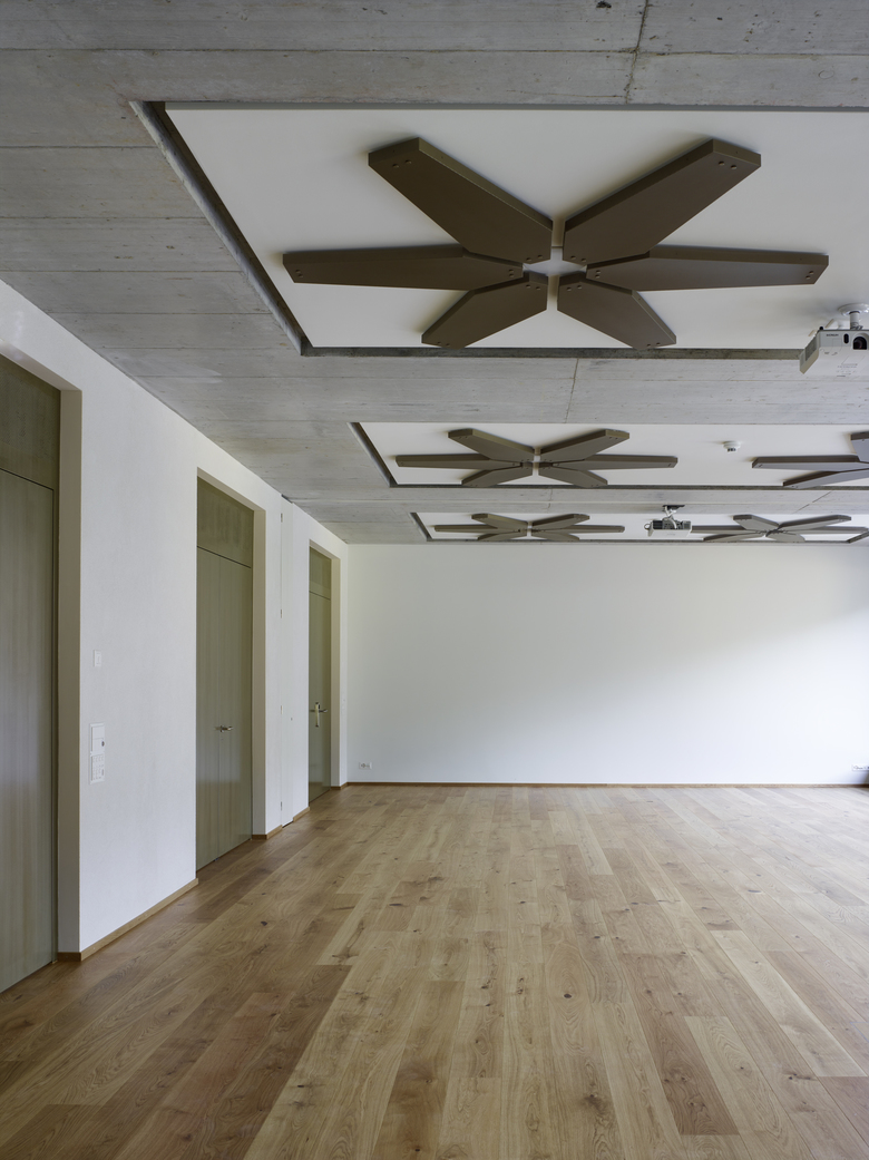Abschluss und Glanzpunkt der Erweiterung bildet der Mehrzweckraum im Dachgeschoss. Hoch über den Baumwipfeln gelegen können dort alle Bewohner einen freien Blick ins Tal geniessen.