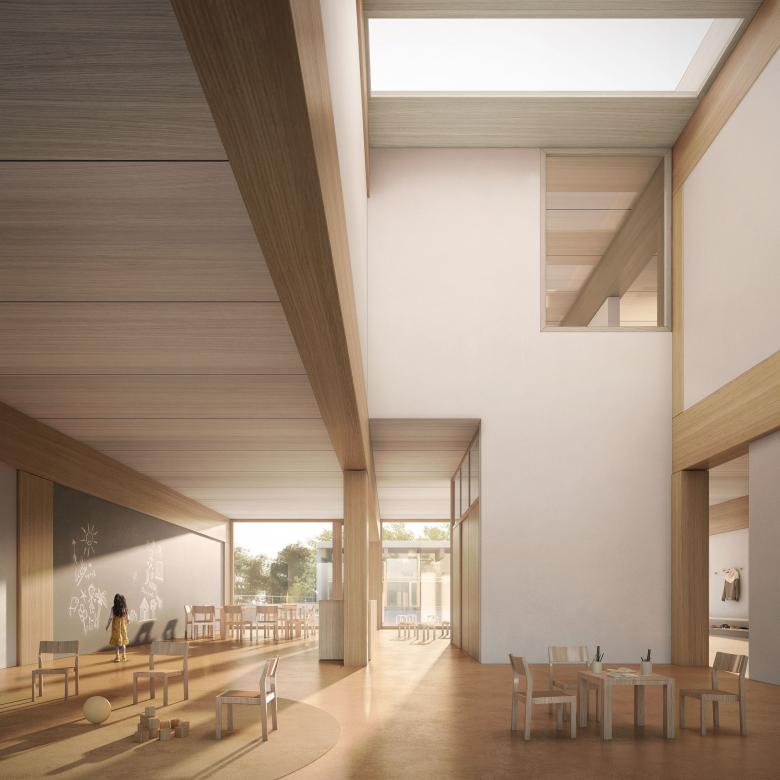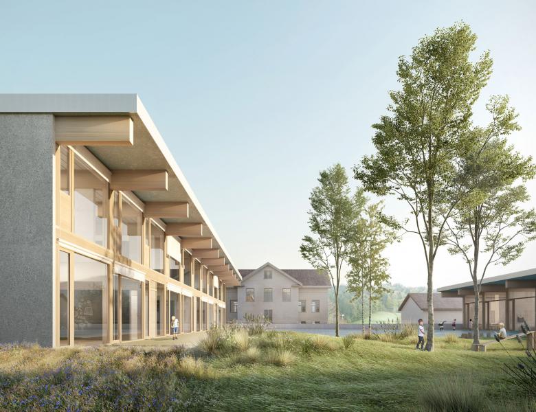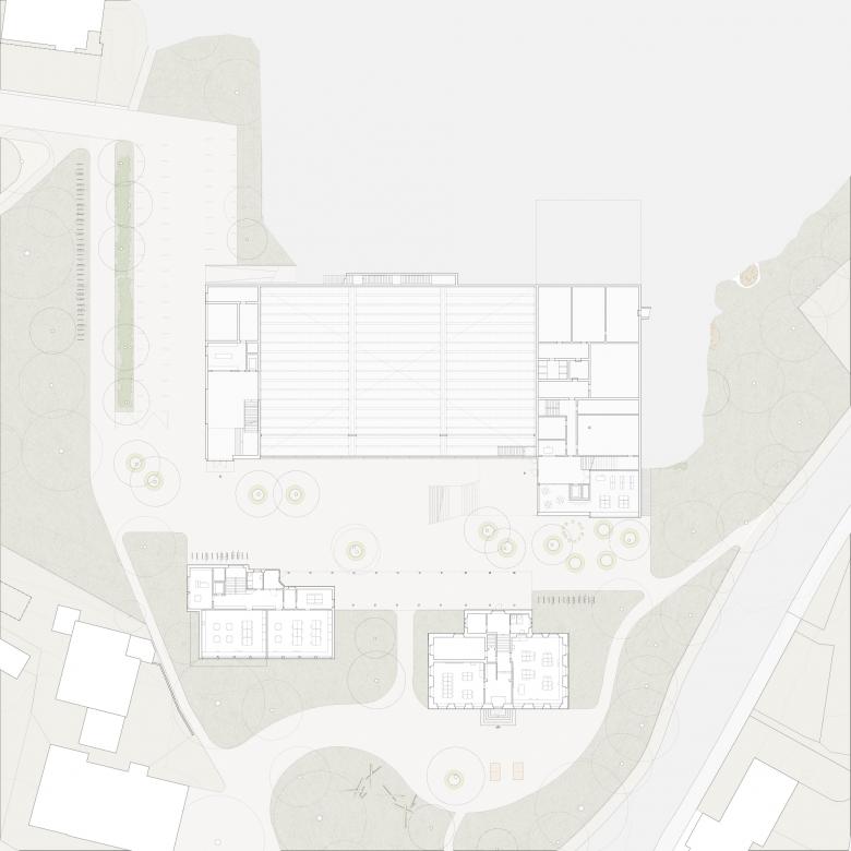 Organisation / Die Schule bleibt in ihrer Organisationsstruktur ähnlich. Die beiden Altbauten werden von Klassenzimmer (Neues Schulhaus) bzw. der Hortnutzung (Altes Schulhaus) entlastet, so dass Räume für Gruppen- und Therapieräume frei werden. Der neue Längsbau ergänzt die beiden bestehenden Bauten als drittes Schulhaus, mit Klassenzimmern, den Kindergärten und der Bibliothek.Der quadratische Neubau umfasst das Foyer der Turnhalle, den Hort sowie den Saal. Letztere haben einen direkten Bezug zum neuen oberen Pausenplatz und ermöglichen verschiedenste Synergien für Schüler- oder Elternanlässe aber auch für Fremdvermietungen.