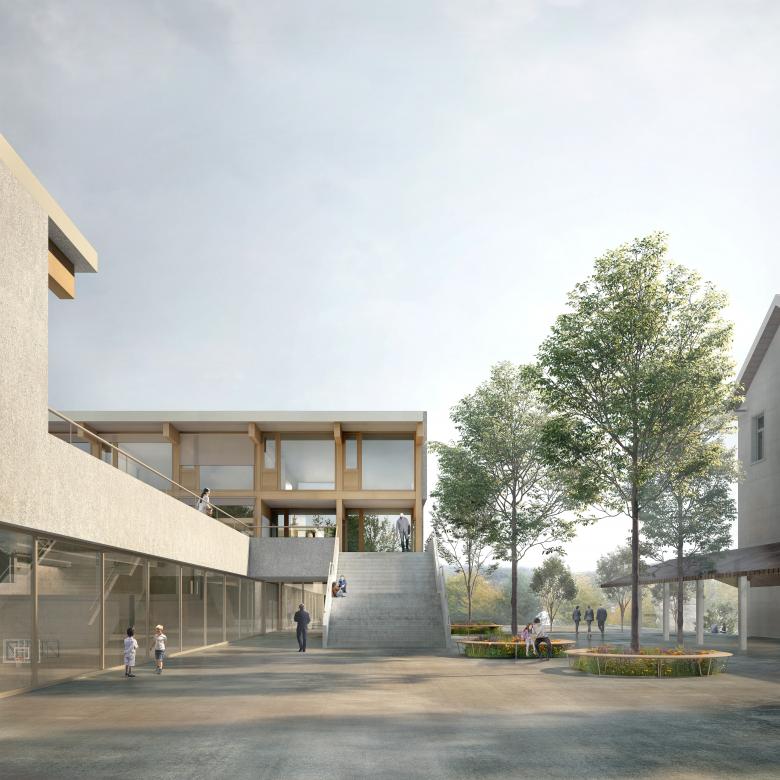 Mit den beiden vorgeschlagenen Neubauten, soll das räumliche Prinzip der Terrassierung beibehalten, jedoch die Beziehung der verschiedenen Niveaus gestärkt werden. Der zentrale Pausenplatz wird über eine grosszügige Treppe mit dem oberen Pausenplatz und dem Sportbereich verbunden und gegen Norden hin geöffnet. Die ortspezifische Stufenlandschaft wird dadurch sicht- und erlebbar gemacht und zudem programmatisch gestärkt.Ein langgezogenes Volumen schliesst das Geviert zum steil abfallenden Hang im Osten ab, ein quadratischer Flachbau im Westen bildet den Dreh- und Angelpunkt und schafft eine adäquate Adressierung der Schule. Die Turnhalle ist halbvergraben und zeichnet die Terrassierung präzise nach.