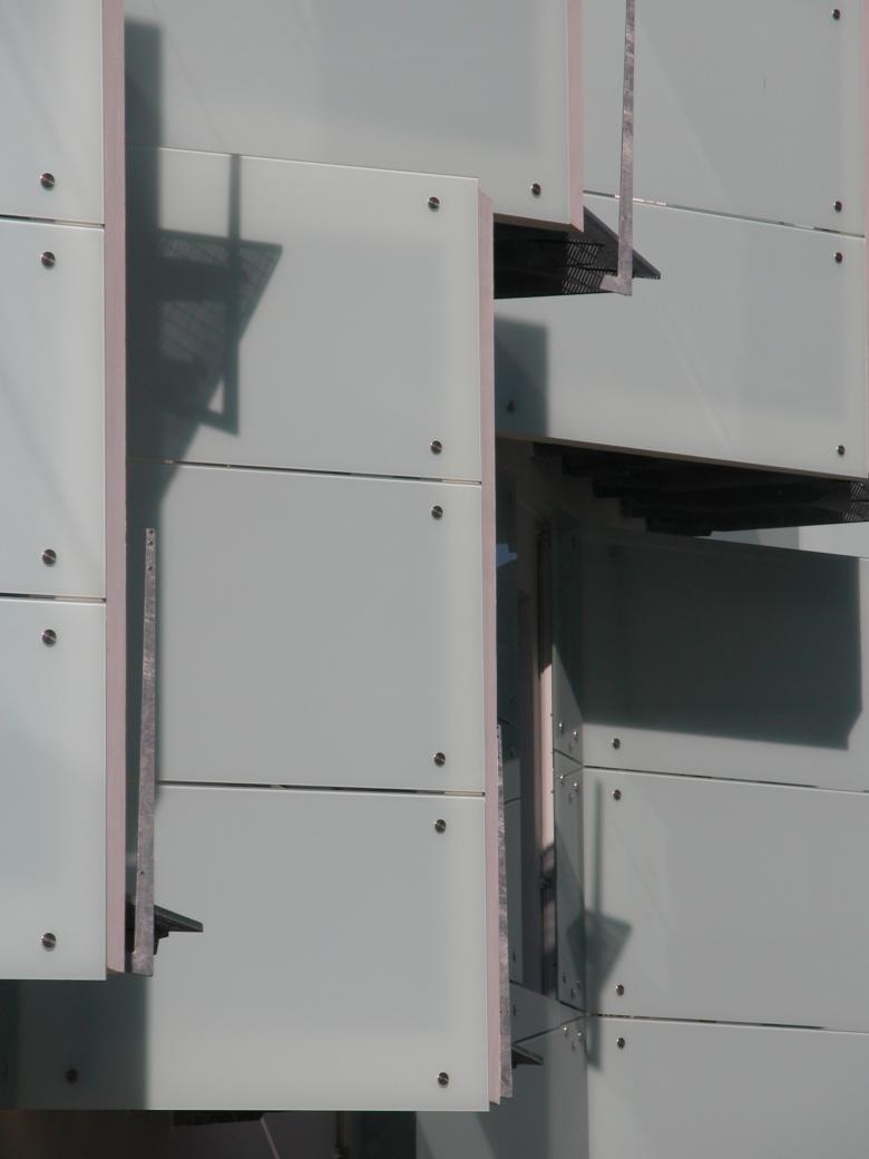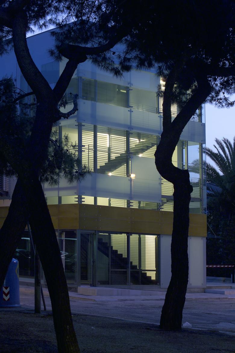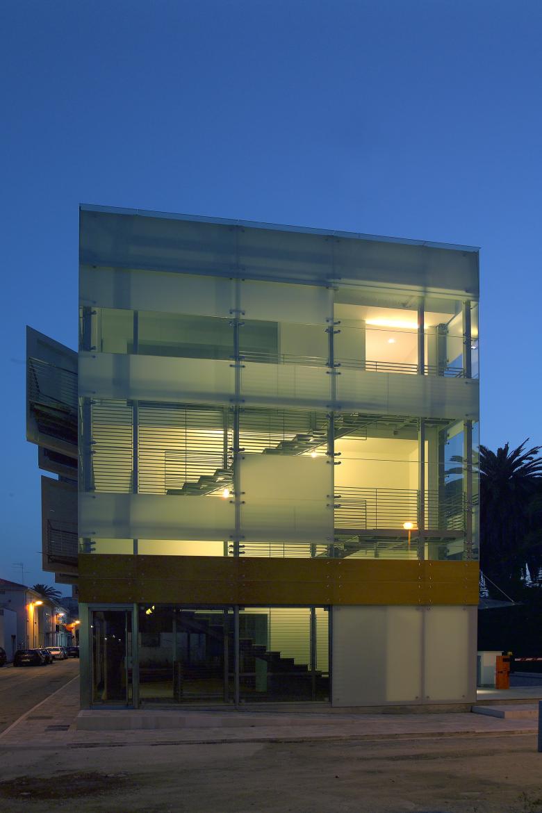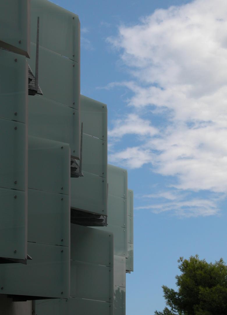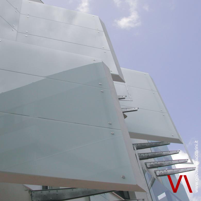 - il tema dell’introspezione e della regolazione/captazione della luce, indotto dalle forti presenze di confine, argomento generatore di una pelle in vetro che avvolge l’edificio, diventa l’interfaccia tra interno esterno, regolatore della luce ed elemento unificante, che camaleonticamente muta geometria e forma, “registrando” gli usi molteplici che avvolge. Una pelle che si sfoglia e piega costituendo uno schermo di protezione visiva ed, allo stesso tempo, una macchina per la captazione della luce. La pelle è il luogo dei riflessi, dei riverberi visivi; le finestre scompaiono, le “squame” disegnano tagli e sporti, una sorta di superficie “a spessore”.